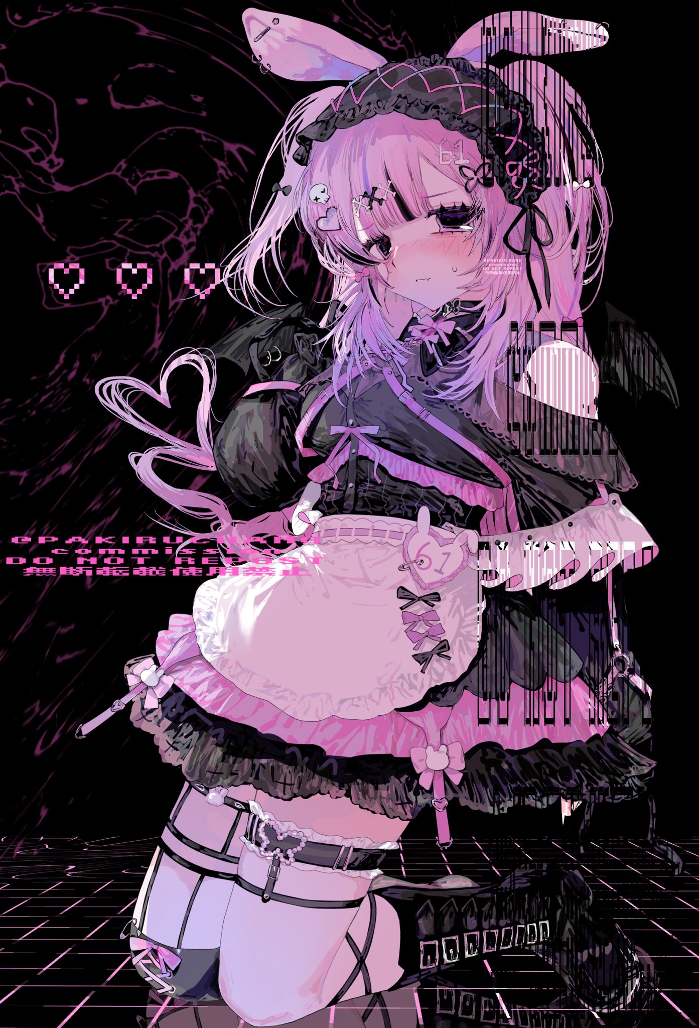 1girl animal_ears apron black_boots black_eyes black_headdress boots closed_mouth commission full_body highres kneeling long_hair maid maid_apron original pakiruchang pink_hair rabbit_ears skeb_commission solo thighhighs white_thighhighs