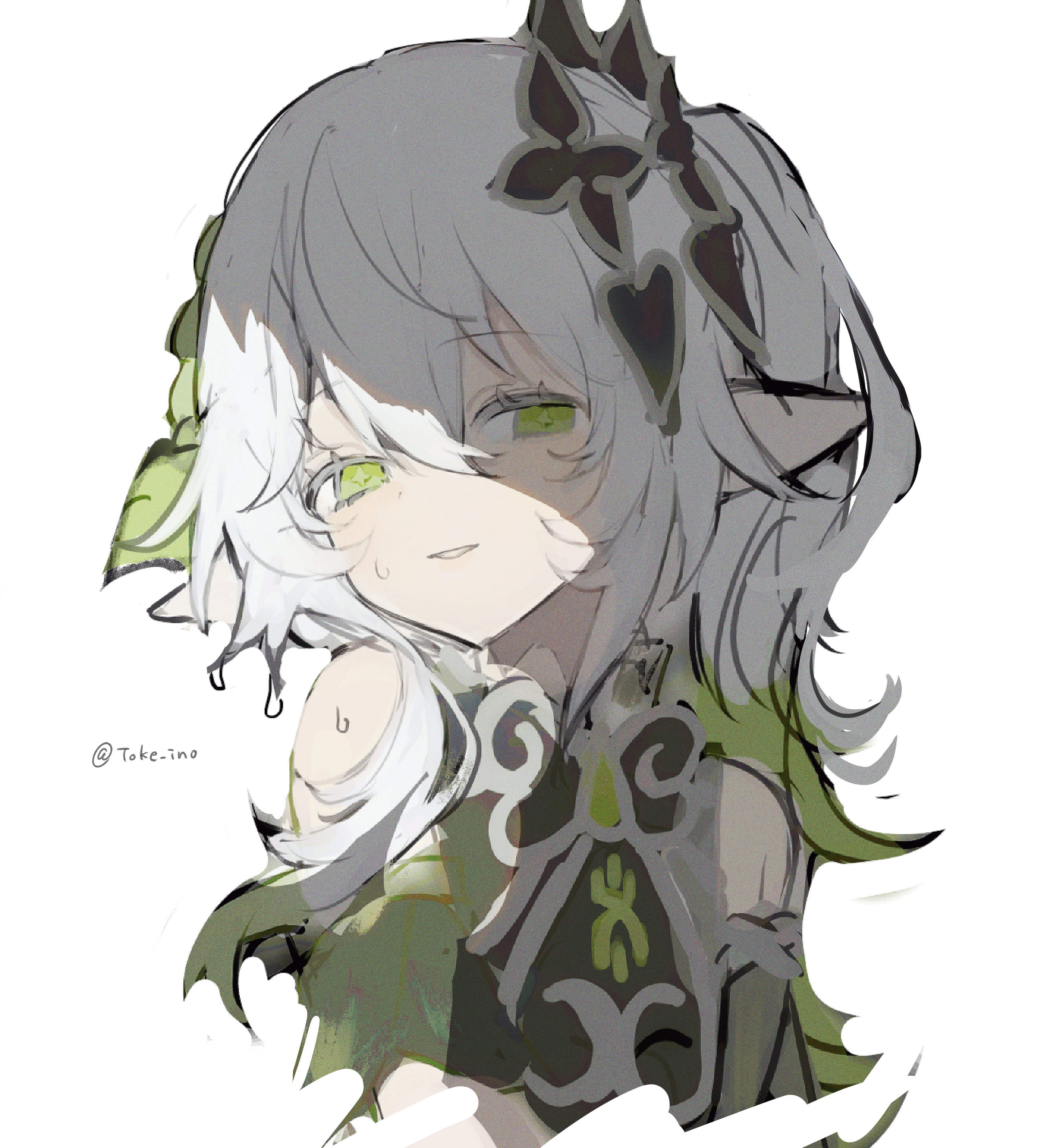 1girl absurdres bare_shoulders detached_sleeves genshin_impact green_eyes green_hair green_sleeves hair_between_eyes hair_ornament highres leaf_hair_ornament multicolored_hair nahida_(genshin_impact) pointy_ears side_ponytail sleeveless solo toke_ino white_background white_hair