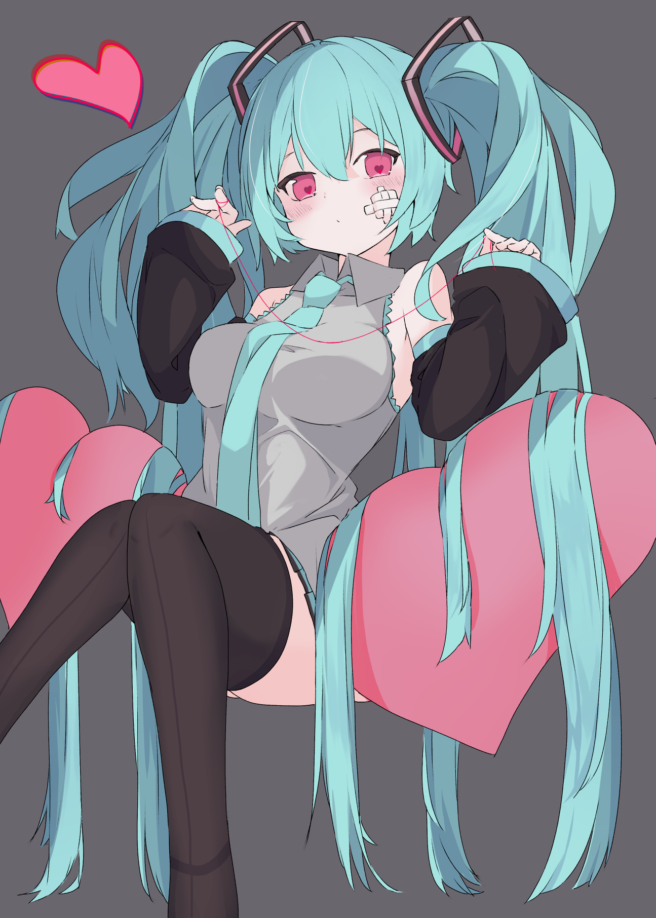 1girl aqua_hair aqua_necktie bare_shoulders black_pantyhose black_sleeves black_thighhighs breasts grey_shirt hair_ornament hatsune_miku heart heart-shaped_pupils heart_in_eye highres large_breasts long_hair mochiyo necktie pantyhose shirt simple_background symbol-shaped_pupils symbol_in_eye thighhighs twintails vocaloid zettai_ryouiki