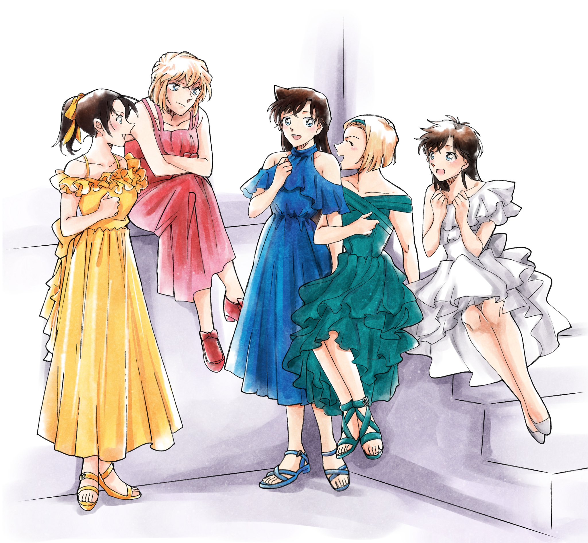 5girls :d ^_^ black_hair blue_dress blue_eyes blue_sandals brown_hair clenched_hands closed_eyes closed_mouth collarbone crossed_arms crossed_legs dress full_body green_dress green_hairband green_sandals hairband high_ponytail highres indoors long_hair looking_at_another meitantei_conan miyano_shiho mouri_ran multiple_girls nakamori_aoko off-shoulder_dress off_shoulder open_mouth ponytail red_dress sandals sayaendou0426 short_hair sleeveless sleeveless_dress smile stairs standing suzuki_sonoko teeth tooyama_kazuha upper_teeth_only white_dress yellow_dress yellow_sandals