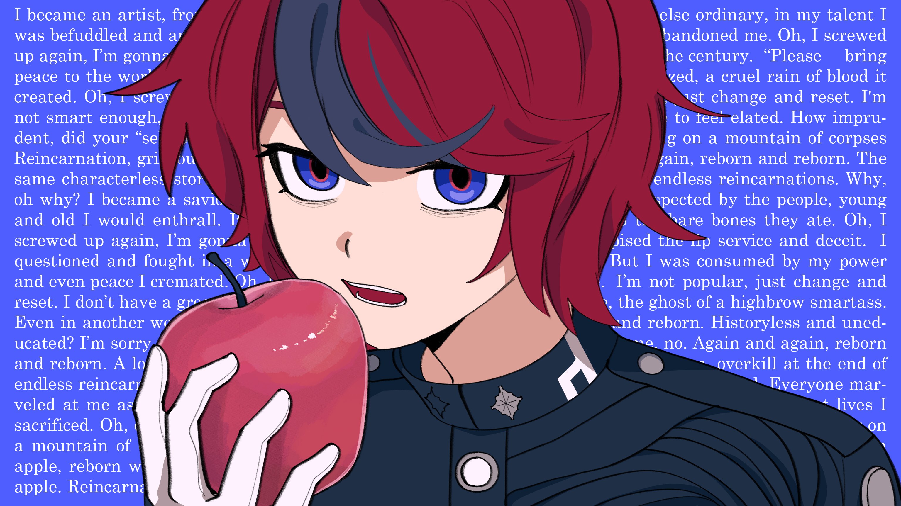 1boy apple blue_background blue_eyes commentary english_commentary food fruit gloves highres holding holding_food holding_fruit imminent_bite last_defense_academy_school_uniform looking_at_viewer lyrics male_focus multicolored_hair open_mouth portrait red_hair school_uniform short_hair solo streaked_hair sumino_takumi tensei_ringo_(vocaloid) the_hundred_line_-last_defense_academy- white_gloves zero_(misamxsa08)