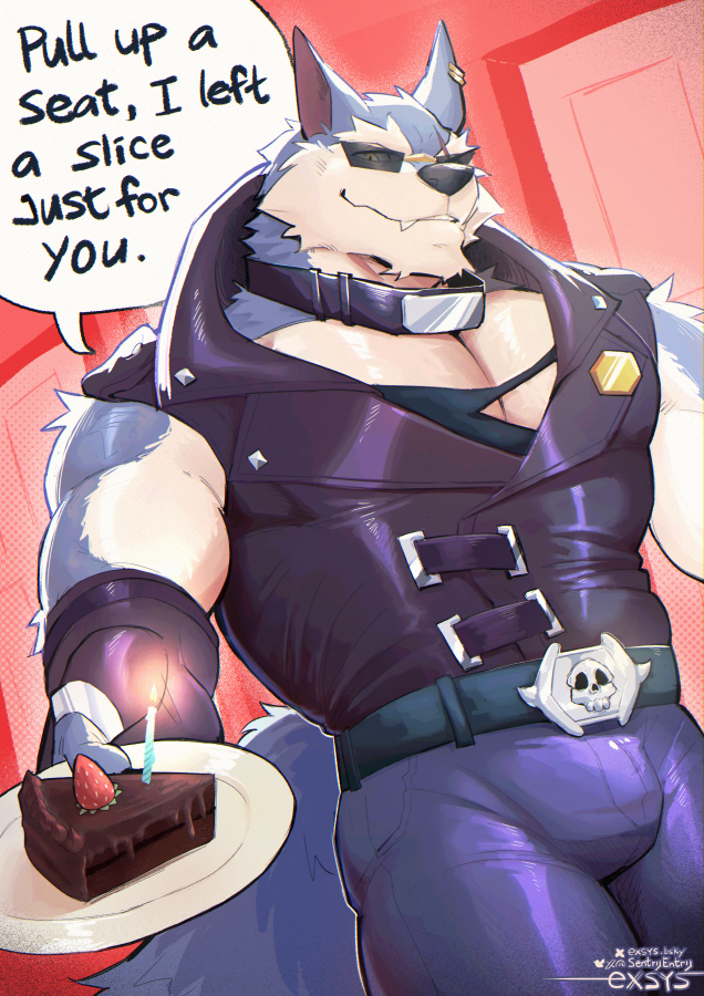 1boy agileentry animal_ears artist_name bara black_gloves black_vest bluesky_username cake cake_slice candle claws commentary dislyte earrings english_commentary english_text fang fang_out fingerless_gloves food freddy_(fenrir)_(dislyte) fruit furry furry_male gloves holding holding_plate jewelry looking_at_viewer male_focus muscular muscular_male pectorals plate scar scar_across_eye scar_on_face smile speech_bubble strawberry sunglasses tail torn_clothes twitter_username vest wolf_boy wolf_ears wolf_tail