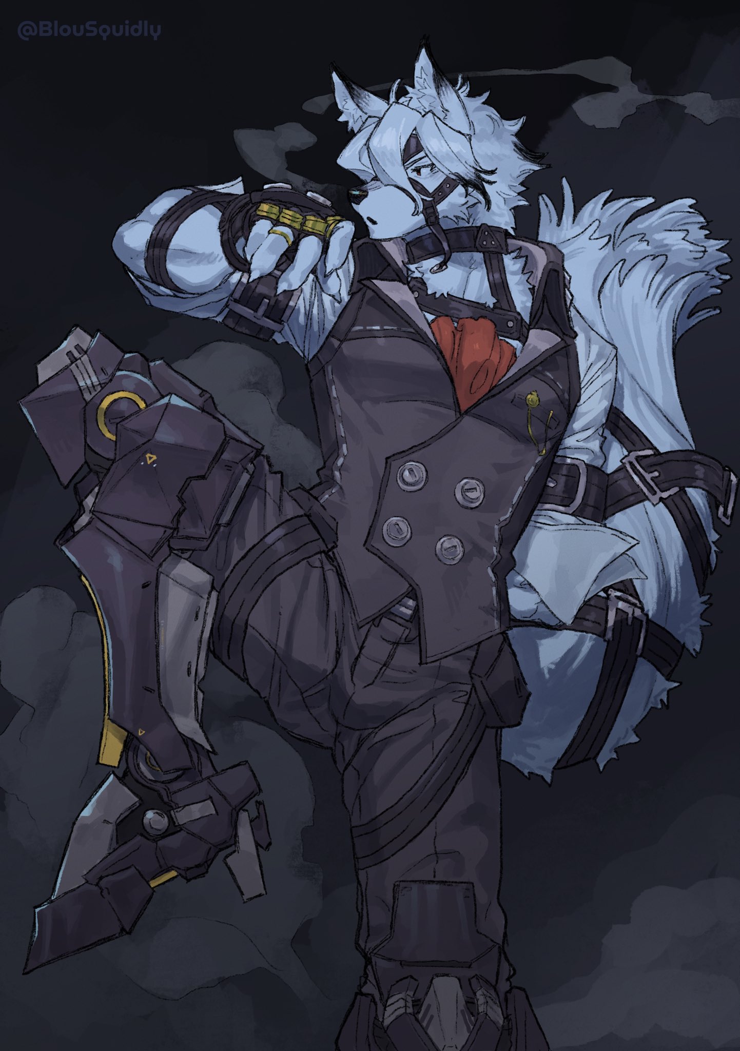 1boy animal_ears arm_behind_back artist_name ascot bicep_strap black_gloves blousquidly colored_tips commentary english_commentary eyepatch fingerless_gloves furry furry_male gloves grey_pants grey_vest highres leg_up male_focus multicolored_hair open_mouth pants profile prosthesis prosthetic_leg red_ascot shirt sleeves_rolled_up standing standing_on_one_leg tail tail_belt twitter_username vest von_lycaon white_shirt wolf_boy wolf_ears wolf_tail zenless_zone_zero