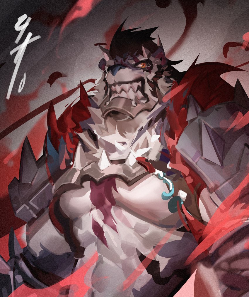 1boy abs animal_ears bad_id bad_twitter_id bara biceps black_fur black_hair clenched_teeth fangs furry furry_male looking_to_the_side male_focus muscular muscular_male pauldrons pectorals scar scar_across_eye scar_on_chest scar_on_face sdorica spiked_pauldrons spikes teeth tiger_boy tiger_ears tiger_stripes vyuga yao_(sdorica)