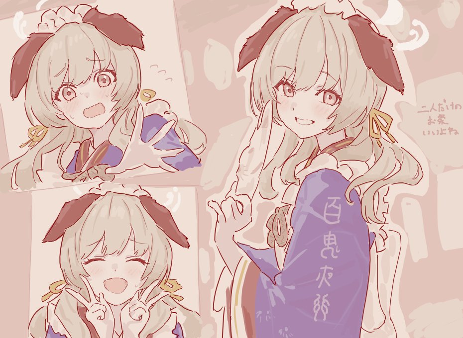 1girl :d ^_^ animal_ears blue_archive closed_eyes double_v fight_yoghurt halo long_sleeves looking_at_viewer low_twintails monochrome multiple_views open_mouth sepia smile translation_request twintails umika_(blue_archive) v