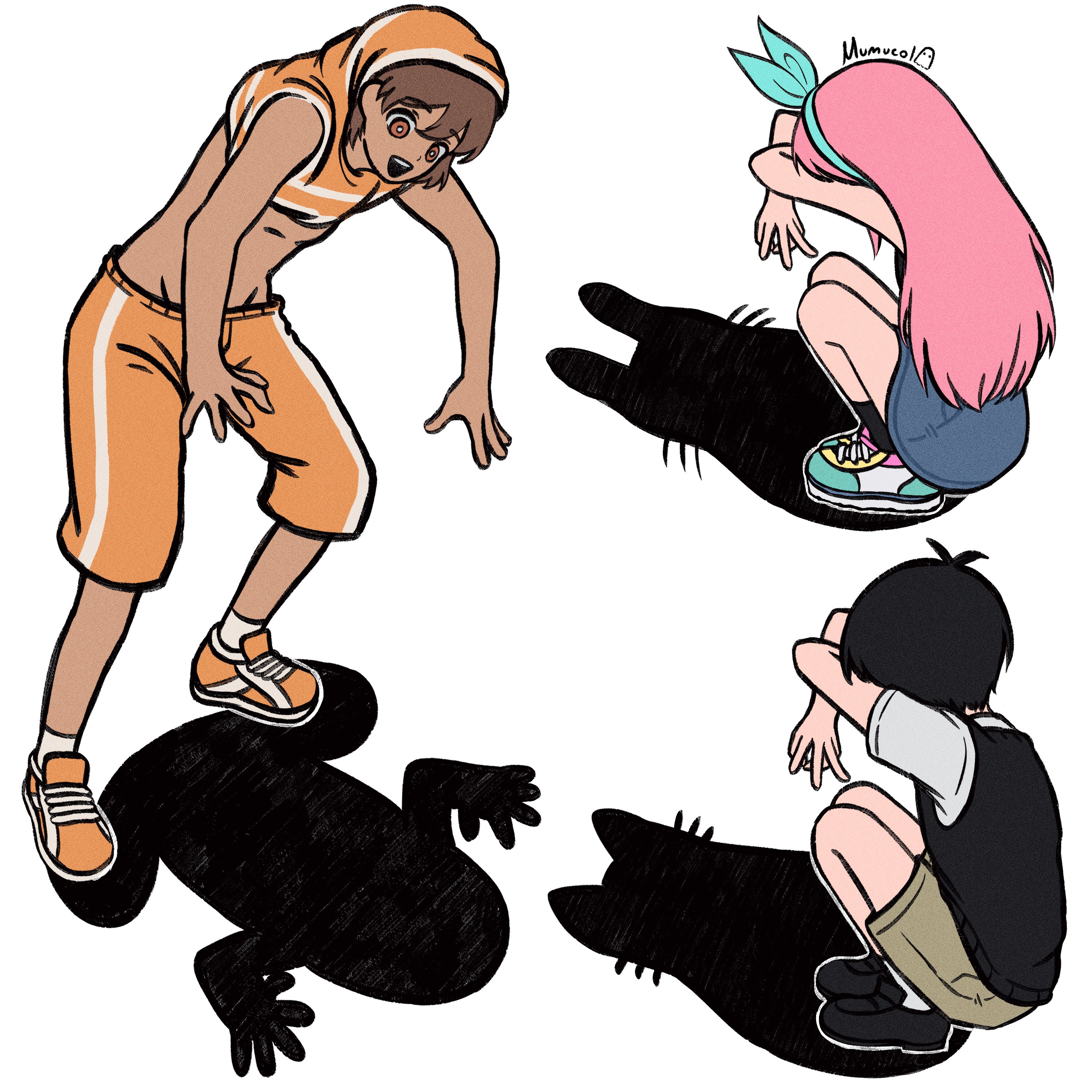1girl 2boys absurdres antenna_hair artist_name aubrey_(faraway)_(omori) aubrey_(omori) black_shoes black_socks black_sweater_vest blue_hairband blue_skirt bright_pupils brown_eyes brown_hair brown_shorts cat_shadow_puppet_(meme) collared_shirt dark-skinned_male dark_skin denim denim_skirt hairband highres kel_(faraway)_(omori) kel_(omori) long_hair meme multiple_boys mumucol omori open_mouth orange_shoes orange_shorts pink_hair shirt shirt_over_head shoes short_hair short_sleeves shorts skirt smile sneakers socks squatting sweater_vest teeth upper_teeth_only white_pupils white_shirt white_socks