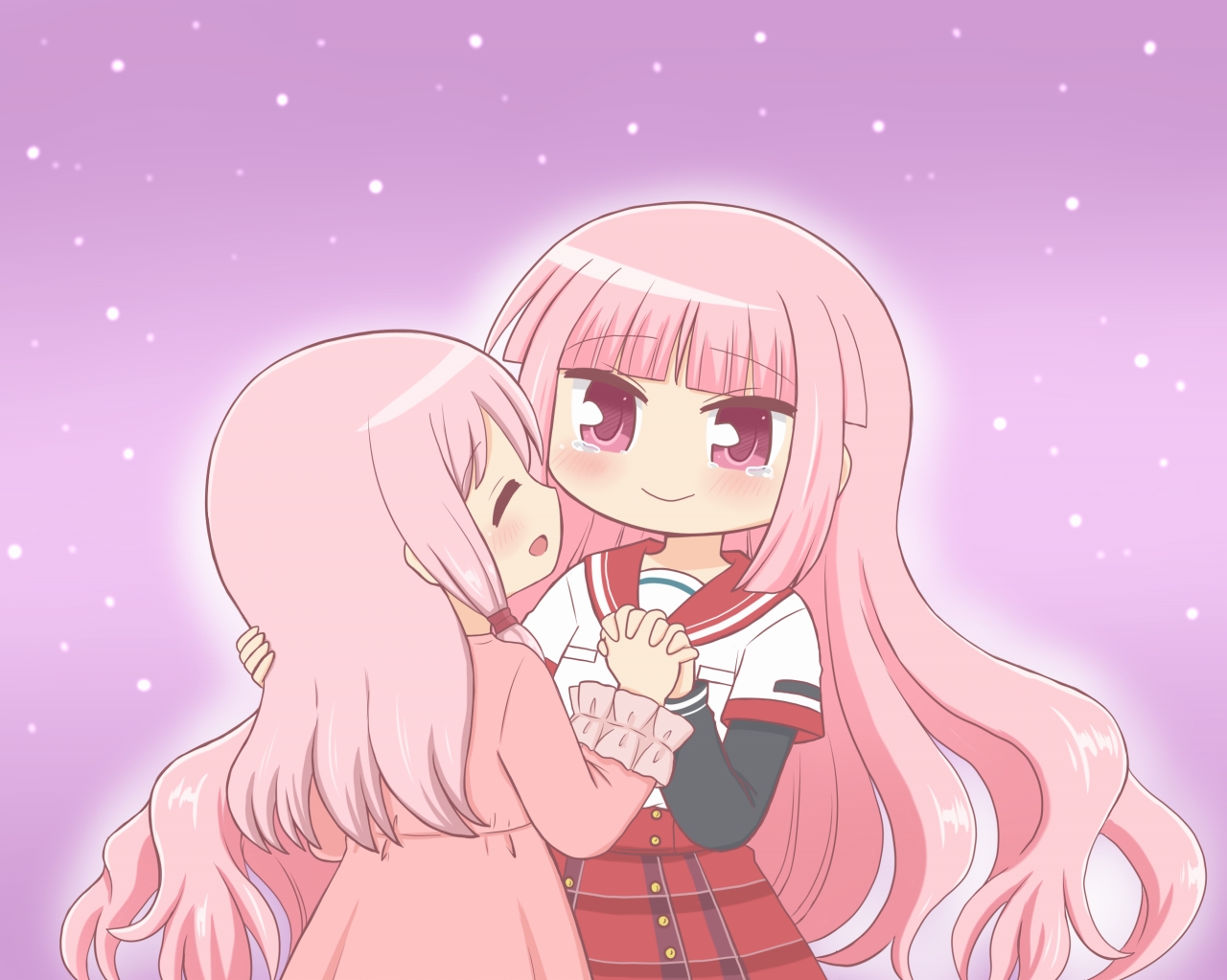 2girls bad_id bad_twitter_id blunt_bangs blush closed_eyes dress holding_hands interlocked_fingers kamihama_university_affiliated_school_uniform layered_sleeves long_hair long_sleeves looking_at_another magia_record:_mahou_shoujo_madoka_magica_gaiden mahou_shoujo_madoka_magica multiple_girls open_mouth pink_dress pink_eyes pink_hair plaid_clothes plaid_skirt purple_background reverse_(bluefencer) sailor_collar school_uniform serafuku shirt short_over_long_sleeves short_sleeves siblings sisters skirt smile tamaki_iroha tamaki_ui tamaki_ui_(hospital_costume) tears very_long_hair white_shirt