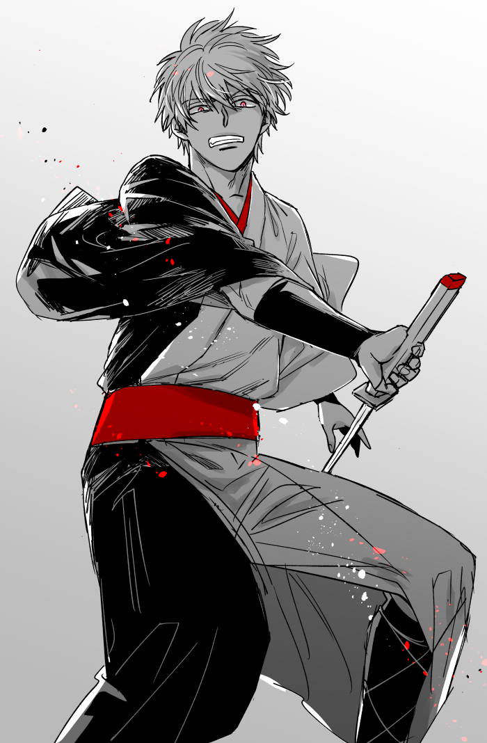 1boy alternate_costume clenched_teeth feet_out_of_frame gintama gradient_background grey_background hair_between_eyes holding holding_sword holding_weapon japanese_clothes katana kimono long_sleeves looking_at_viewer male_focus red_eyes red_sash sakata_gintoki sakurana sash solo spot_color sword teeth two-tone_kimono weapon wide_sleeves wristband