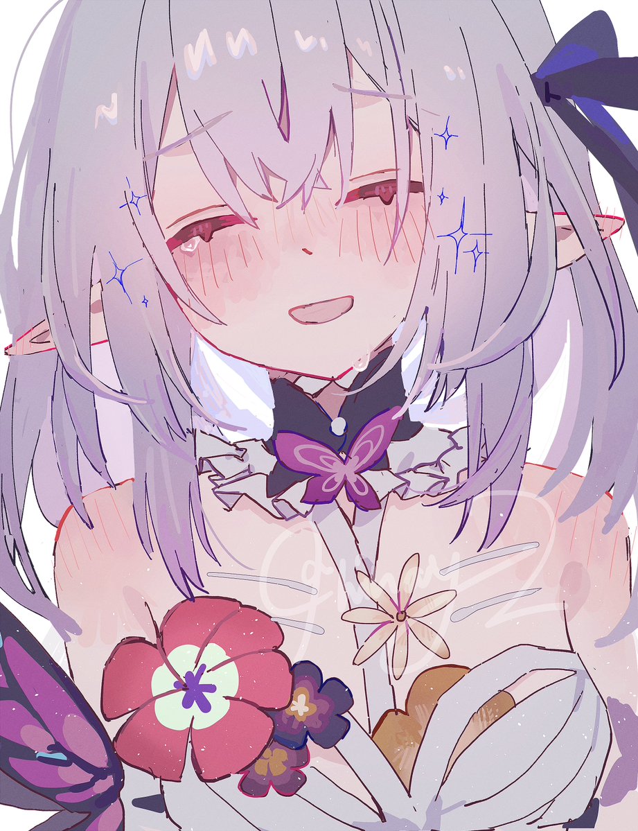 1girl bare_shoulders blush breasts castorice_(honkai:_star_rail) close-up closed_eyes dress flower hinay_2 honkai_(series) long_hair open_mouth pointy_ears purple_flower purple_hair red_flower simple_background smile solo white_background white_dress