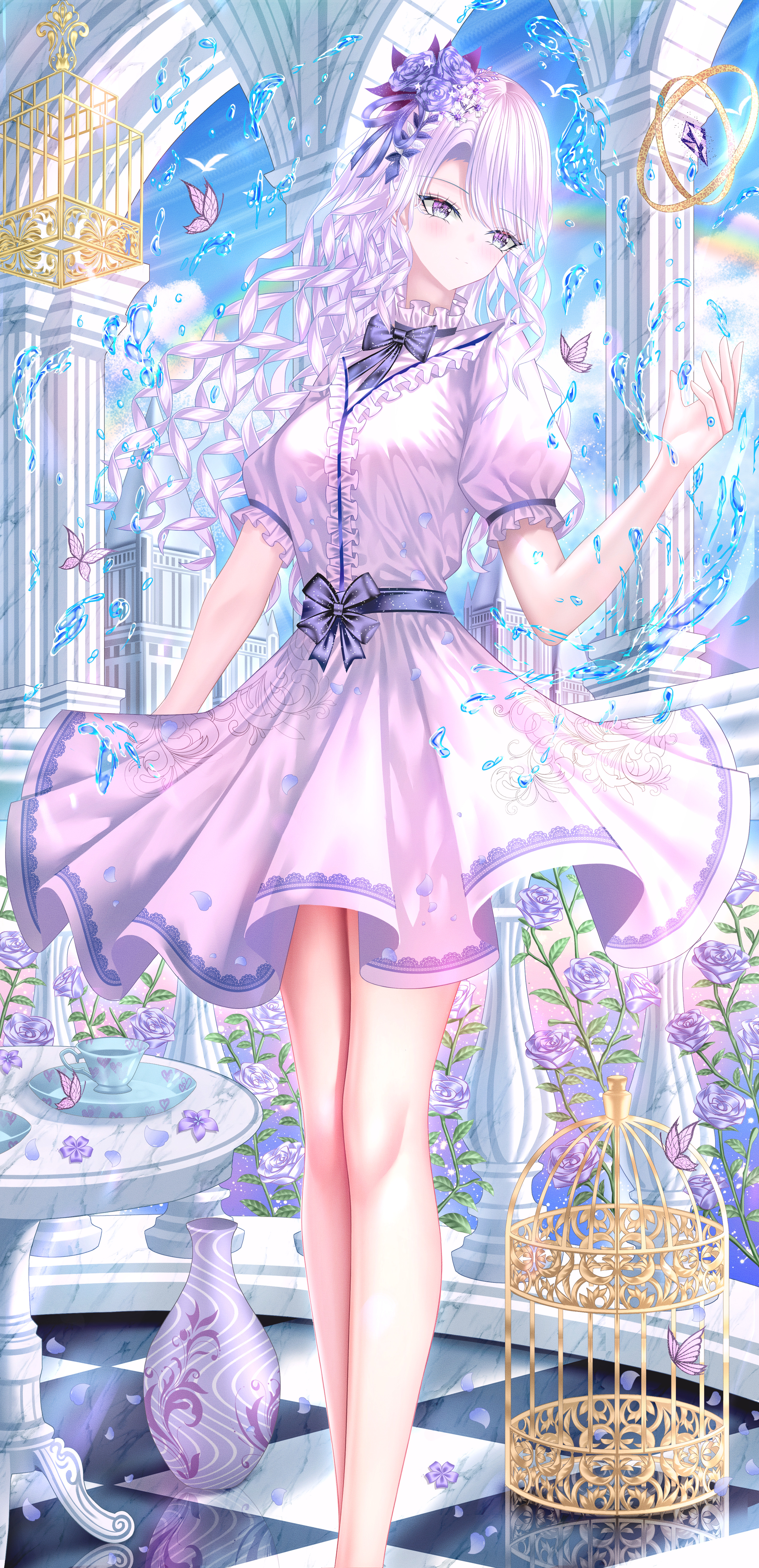 1girl absurdres architecture bird birdcage black_bow black_bowtie blush bow bowtie breasts bug building butterfly cage closed_mouth cloud commentary cup curtained_hair day dress eyelashes feet_out_of_frame flower hair_flower hair_ornament highres hydrokinesis insect large_breasts long_hair original pillar pink_butterfly pink_dress plate puffy_short_sleeves puffy_sleeves purple_butterfly purple_eyes purple_flower purple_hair purple_rose rainbow ringlets rose short_sleeves sky smile solo standing untranslatable_commentary table teacup tina_(tinafya) vase water