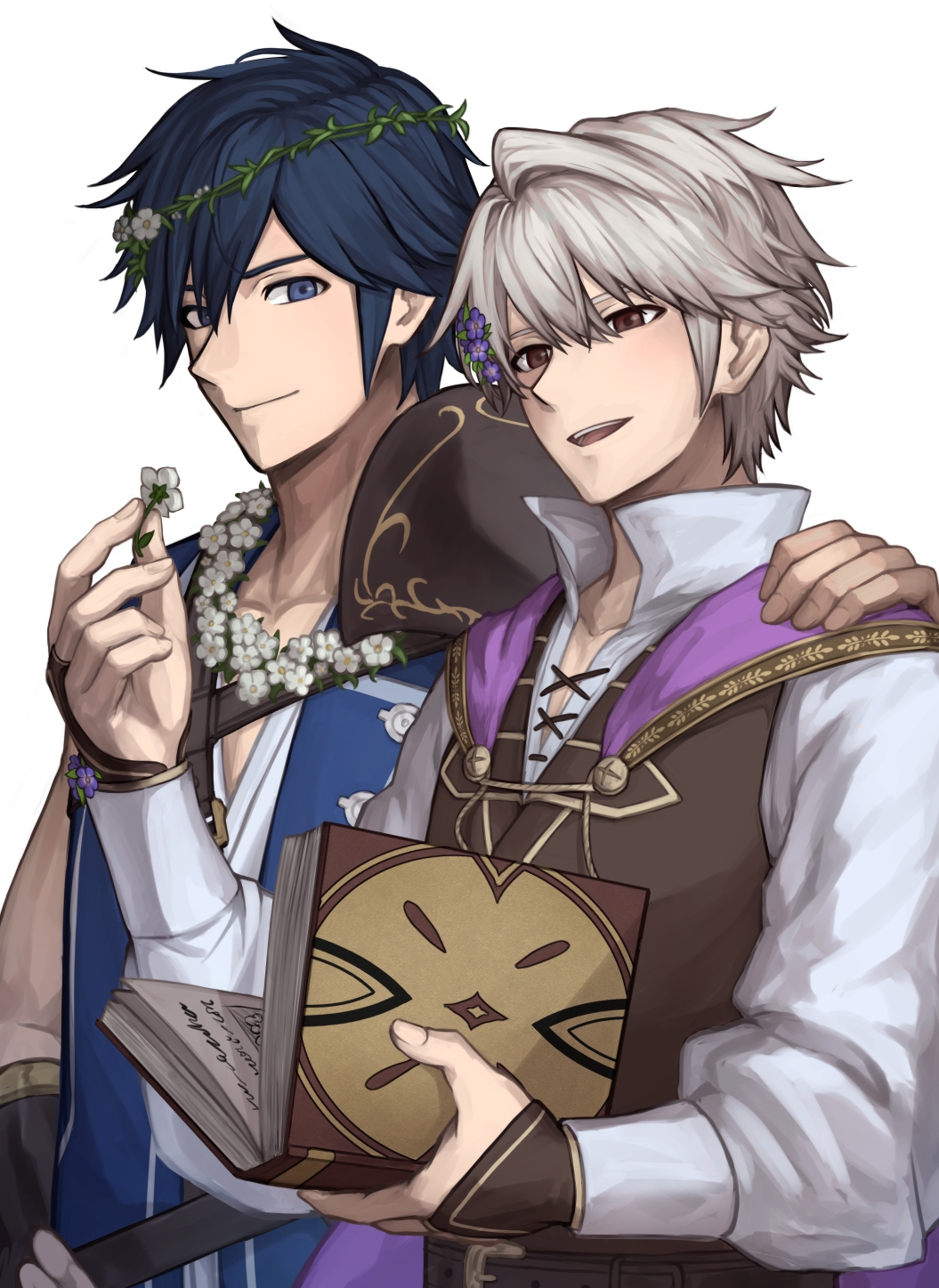2boys blue_eyes blue_hair book brown_eyes brown_vest chrom_(fire_emblem) chrom_(valentine)_(fire_emblem) fire_emblem fire_emblem_awakening fire_emblem_heroes flower flower_necklace hand_on_another's_shoulder highres holding holding_book jewelry long_sleeves male_robin_(fire_emblem) male_robin_(valentine)_(fire_emblem) multiple_boys necklace nintendo shirt short_hair simple_background upper_body vest white_background white_flower white_shirt zuzu_(ywpd8853)