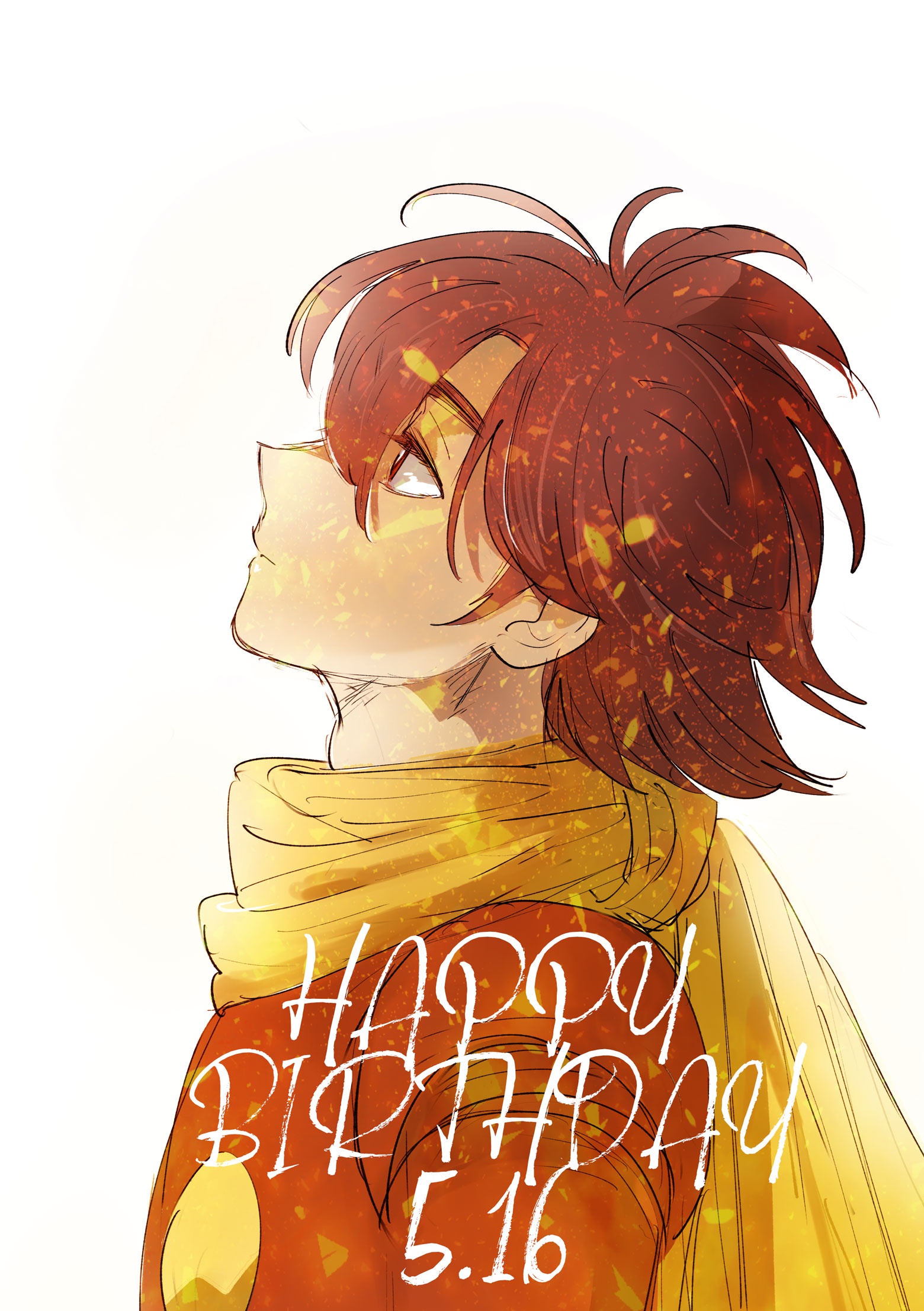 1boy ahoge brown_eyes brown_hair buttons coat cyborg cyborg_009 happy_birthday highres looking_up male_focus military_uniform red_coat scarf shimamura_joe short_hair soldier spiked_hair standing turuwmtw upper_body yellow_scarf