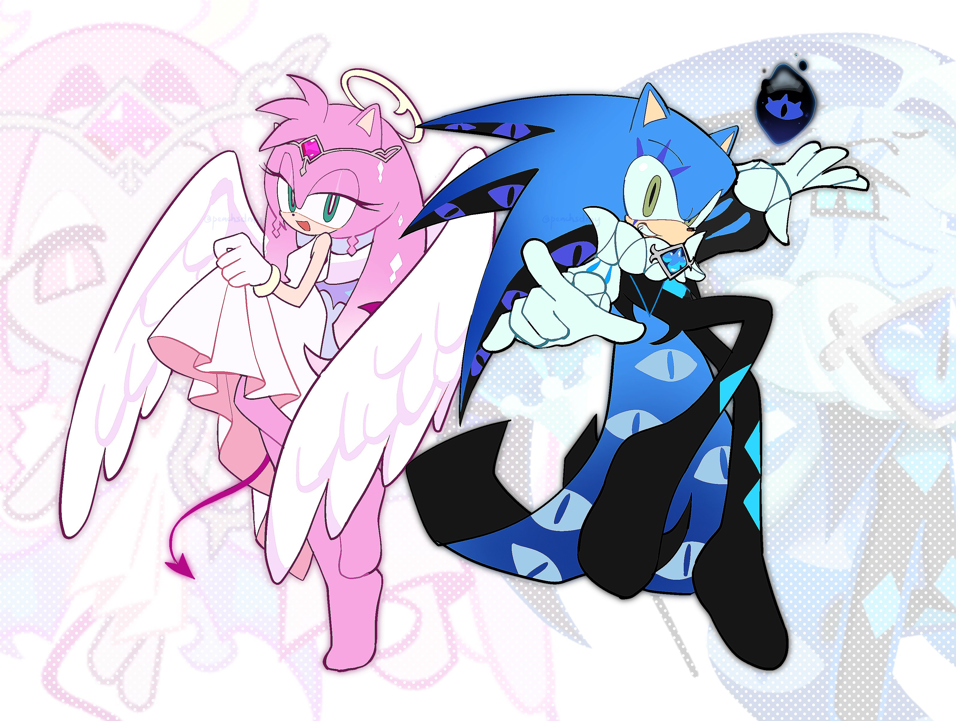 1boy 1girl absurdres amy_rose angel_wings black_bodysuit blue_fur bodysuit cape circlet commentary cookie_run cookie_run:_kingdom cosplay demon_tail dress english_commentary eternal_sugar_cookie eternal_sugar_cookie_(cosplay) eye_print full_body furry furry_female furry_male gloves green_eyes halo highres holding_own_dress peachsdmy pink_fur pink_tail puffy_sleeves shadow_milk_cookie shadow_milk_cookie_(cosplay) smile sonic_(series) sonic_the_hedgehog tail white_dress white_gloves white_wings wings