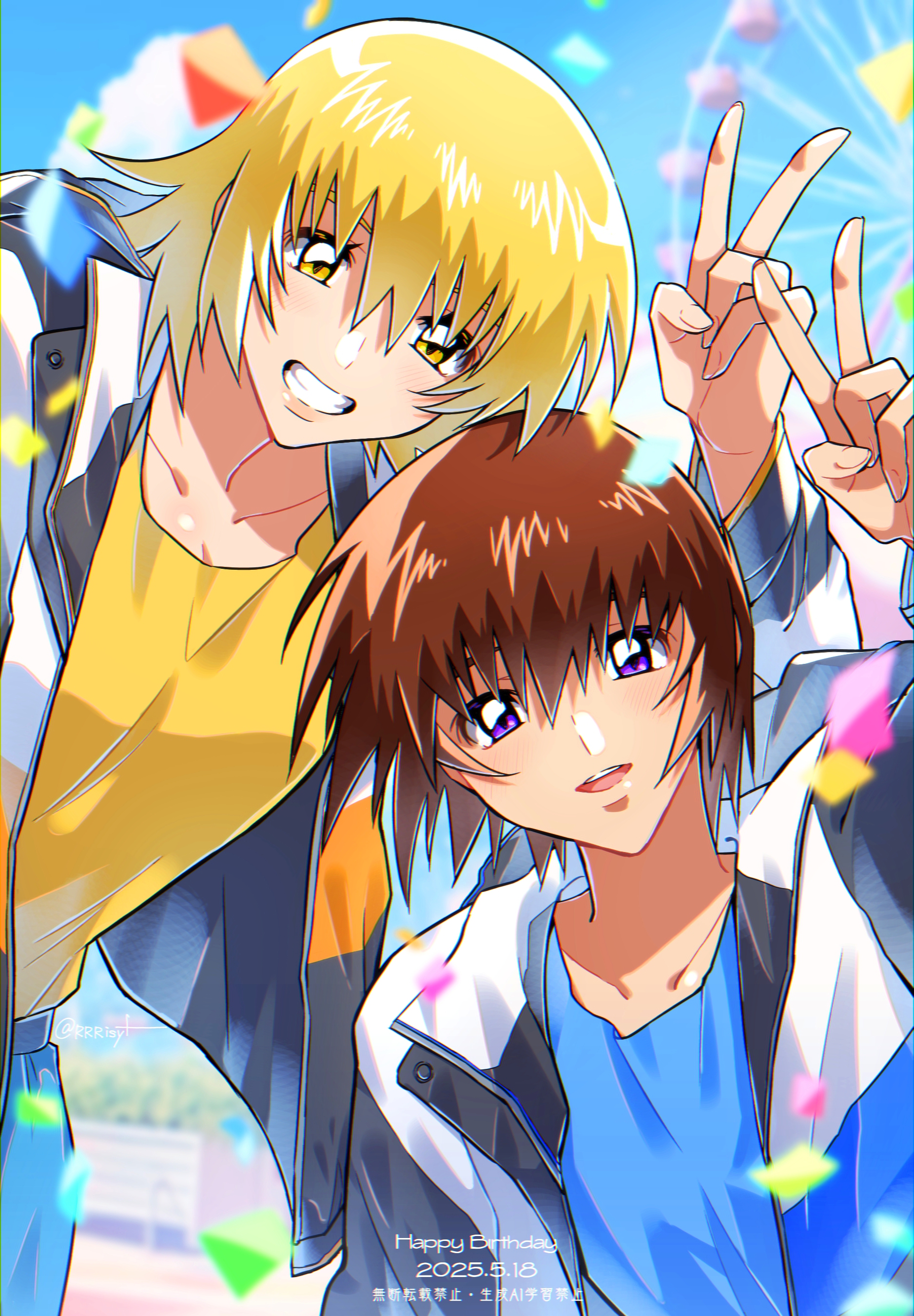 1boy 1girl absurdres blonde_hair breasts brother_and_sister brown_hair cagalli_yula_athha commentary_request dated english_text gundam gundam_seed happy_birthday highres jacket kira_yamato looking_at_viewer mixed-language_text open_mouth purple_eyes rrrisyf shirt short_hair siblings smile sportswear twins v yellow_eyes