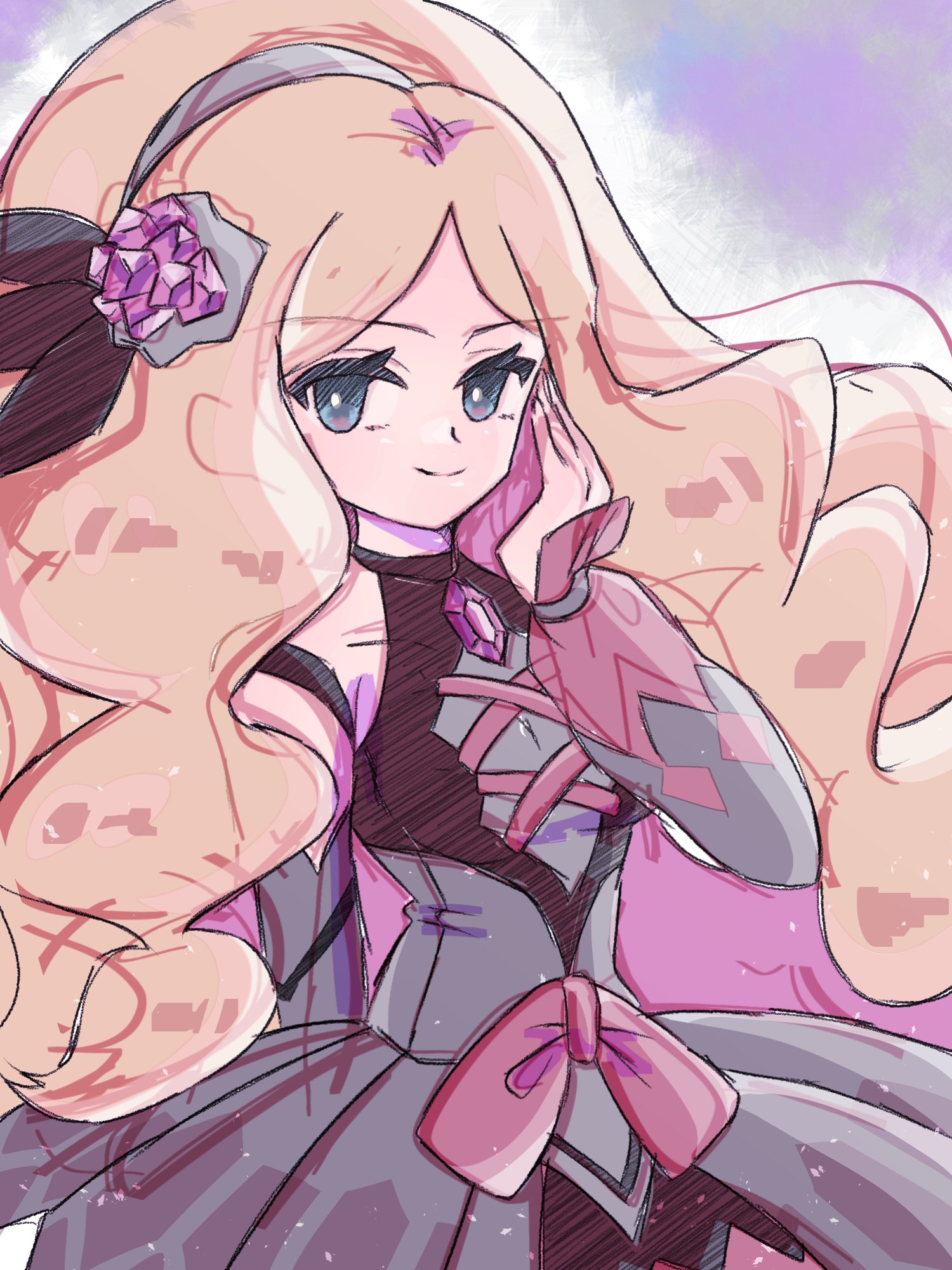 1girl black_dress blonde_hair blue_eyes caitlin_(fall_2021)_(pokemon) caitlin_(pokemon) closed_mouth detached_sleeves dress hair_ornament hairband highres long_hair looking_at_viewer ngo_(ngo_hotategoya) nintendo official_alternate_costume parted_bangs pokemon pokemon_masters_ex ponytail smile solo very_long_hair