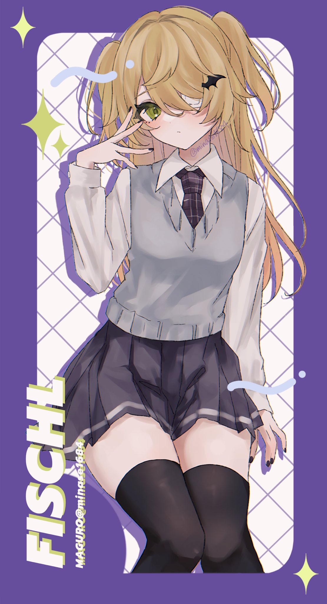 1girl alternate_costume black_nails black_skirt black_thighhighs blonde_hair character_name closed_mouth collared_shirt eyepatch fischl_(genshin_impact) genshin_impact green_eyes hair_between_eyes hair_ornament highres long_hair long_sleeves looking_at_viewer maguro_(minase1684) necktie school_uniform shirt skirt solo thighhighs twitter_username two_side_up white_shirt zettai_ryouiki