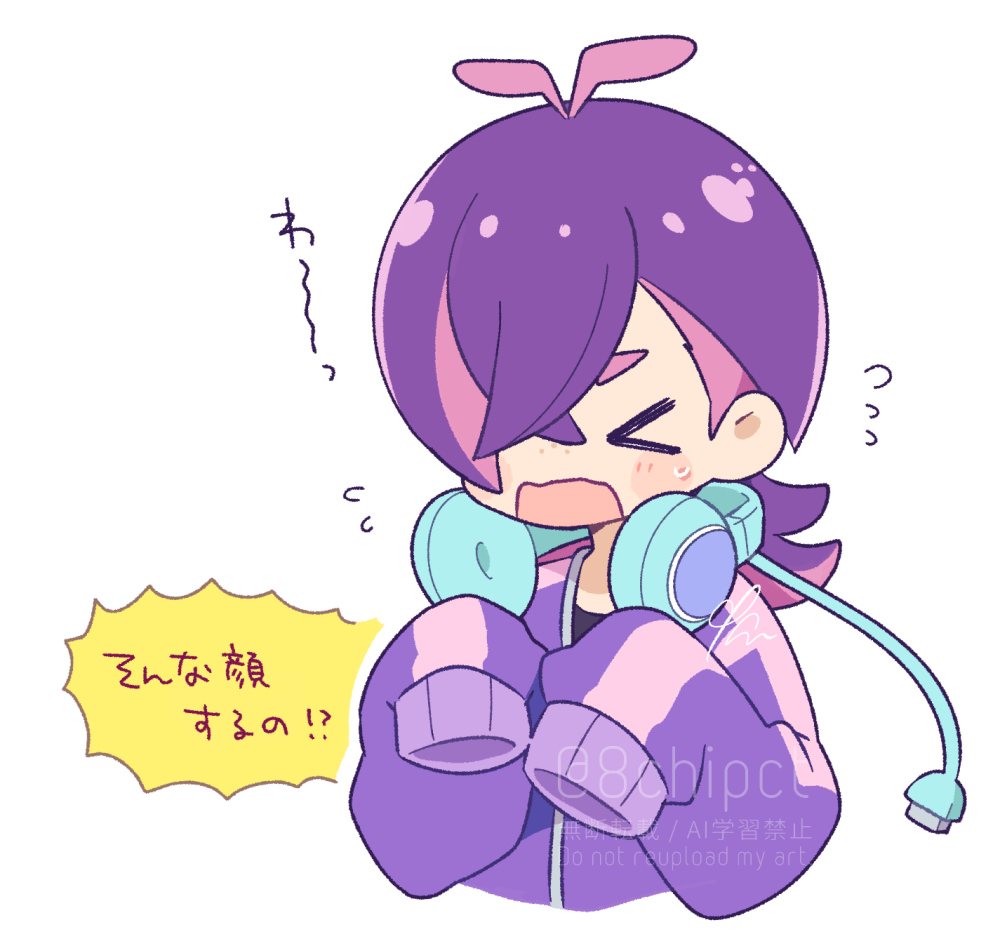 >_< 0zr8hc 1girl antenna_hair blush_stickers cable closed_eyes commentary crossed_bangs dot_(pokemon) flying_sweatdrops hands_up headphones jacket long_hair long_sleeves nintendo open_mouth pokemon pokemon_(anime) pokemon_horizons purple_hair purple_jacket signature solo sweatdrop translation_request twitter_username upper_body watermark white_background