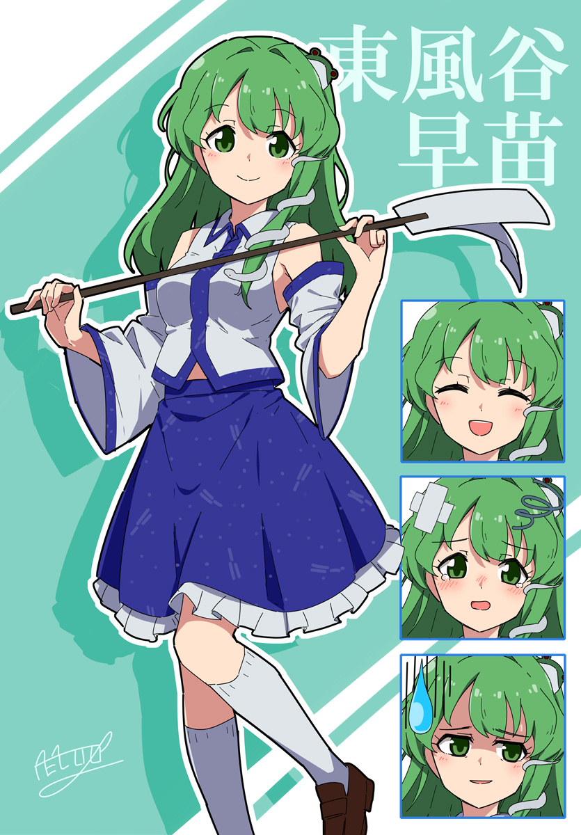 1girl :d ^_^ bandaid bandaid_on_head bare_shoulders blue_skirt blush character_name closed_eyes closed_mouth collared_shirt commentary_request detached_sleeves drop_shadow frilled_skirt frills frog_hair_ornament gohei green_background green_eyes green_hair grey_shirt grey_sleeves hair_ornament highres holding holding_gohei kneehighs kochiya_sanae long_hair looking_at_viewer multiple_views necono_(nekonosora1207) open_mouth parted_lips shirt signature single_sidelock skirt sleeveless sleeveless_shirt smile snake_hair_ornament socks sweatdrop touhou white_socks wide_sleeves