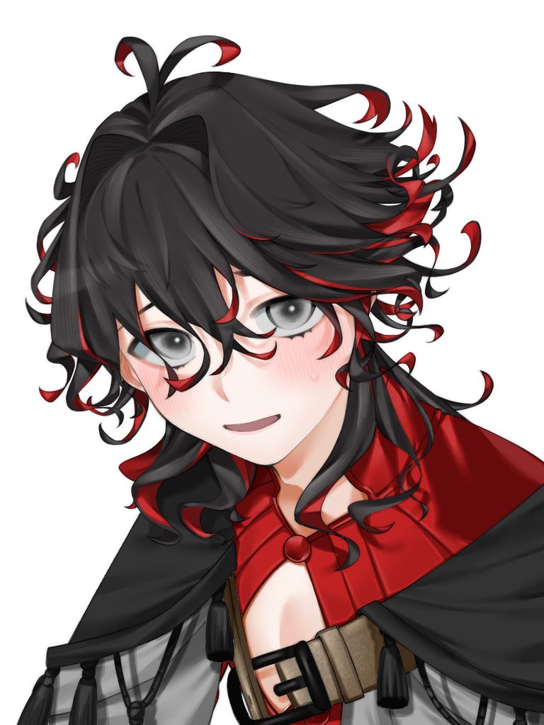 1boy black_hair blush chest_belt colored_inner_hair curly_hair dante_alighieri_(fate) dante_alighieri_(second_ascension)_(fate) fate/grand_order fate_(series) grey_eyes looking_at_viewer male_focus medium_hair multicolored_hair omothi_0141 open_mouth red_hair simple_background solo sweatdrop two-tone_hair upper_body white_background
