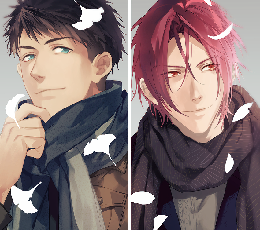 2boys aqua_eyes black_hair curtained_hair free! looking_at_viewer male_focus matsuoka_rin medium_hair multiple_boys okii_(oh_ki_ik) red_eyes red_hair short_hair yamazaki_sousuke yaoi