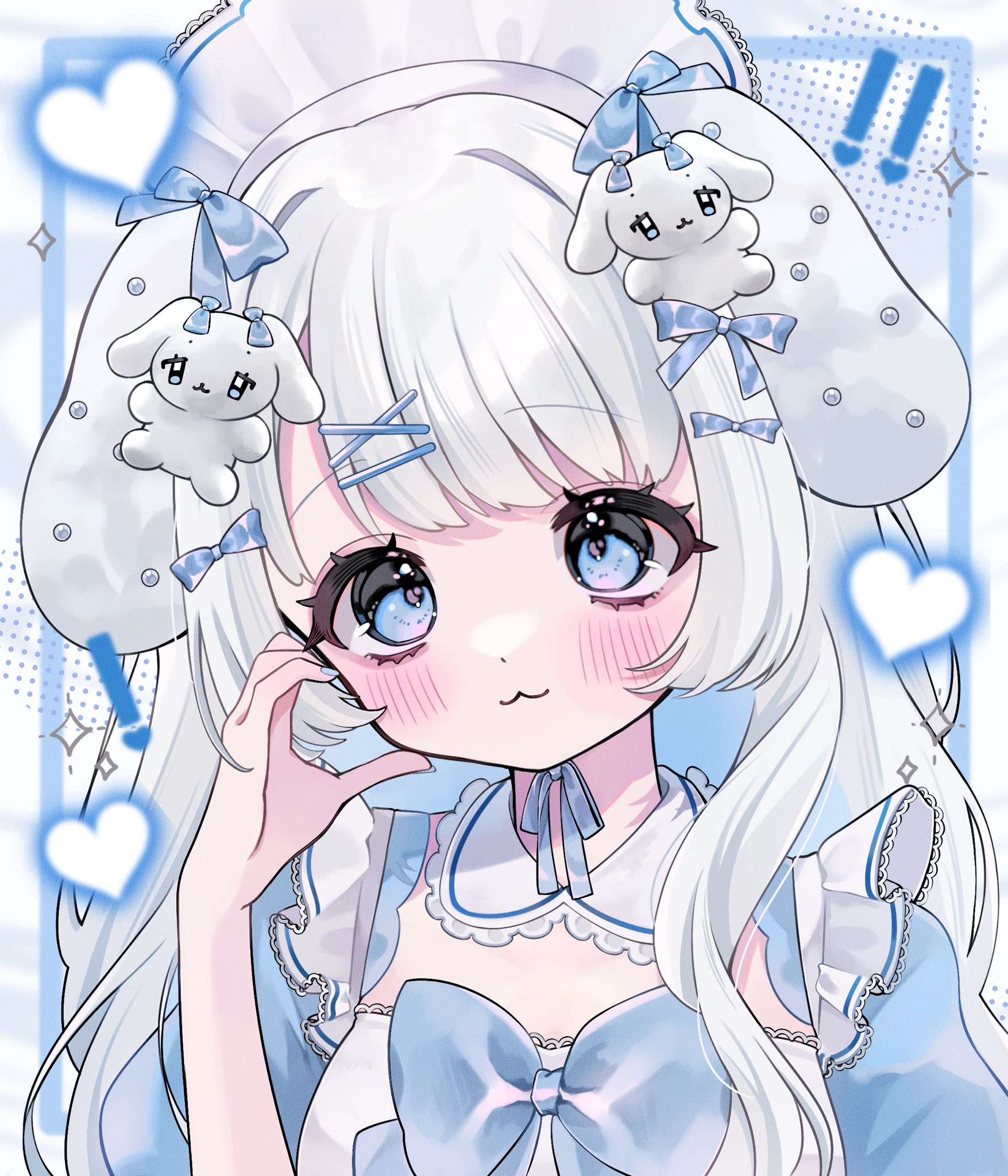 1girl :3 animal_ears blue_bow blue_eyes blue_ribbon blush bow commentary eyelashes fake_animal_ears hair_bow hair_ornament hairclip highres long_hair looking_at_viewer maid maid_headdress original rabbit_hair_ornament ribbon solo untranslatable_commentary tenshi_kaiwai upper_body wata_meuko white_hair