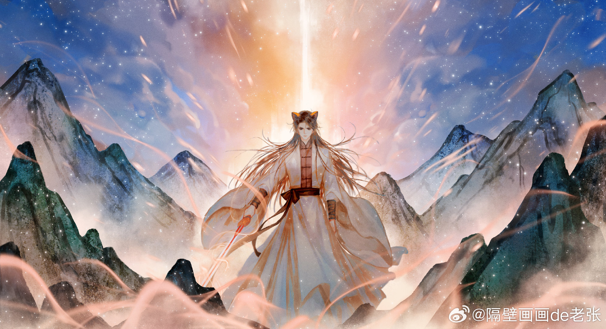 1boy arm_at_side aura black_eyes brown_hair cat_boy chinese_clothes chinese_commentary feet_out_of_frame ge_bihua_hua_lao_zhang glowing hanfu highres holding holding_sword holding_weapon hongmao_(hongmao_and_lantu) hongmao_and_lantu humanization light_particles long_hair long_sleeves looking_at_viewer male_focus mountain outstretched_arm parted_bangs red_sash robe sash serious solo standing straight-on sword watermark weapon weibo_watermark white_robe