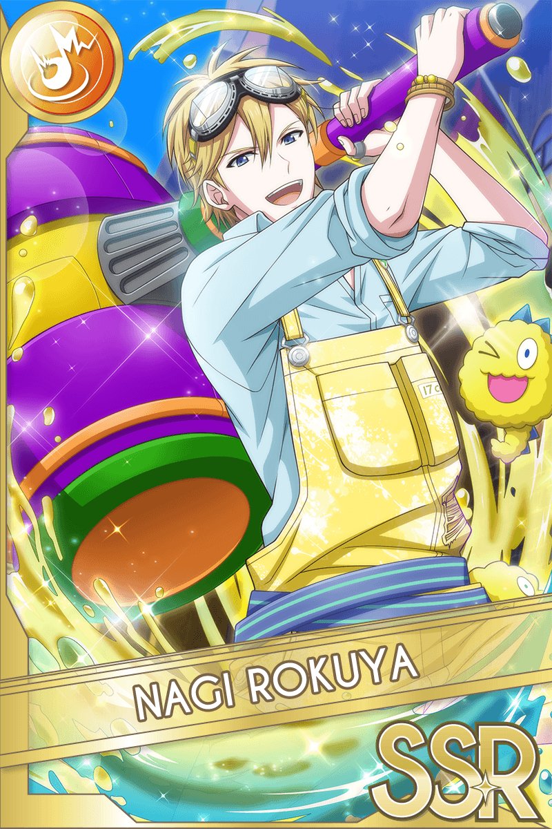 1boy artist_request black-framed_eyewear blonde_hair blue_background blue_eyes blue_shirt bracelet buttons card_(medium) character_name collared_shirt commentary_request cowboy_shot cute_weapon goggles goggles_on_head gold_bracelet hair_between_eyes hammer happy highres holding holding_hammer huge_weapon idolish7 jewelry light_particles male_focus monster multiple_bracelets official_art open_mouth over_shoulder overalls paint pocket rokuya_nagi second-party_source shirt short_hair sleeves_rolled_up smile solo sparkle teeth upper_teeth_only weapon weapon_over_shoulder yellow_overalls