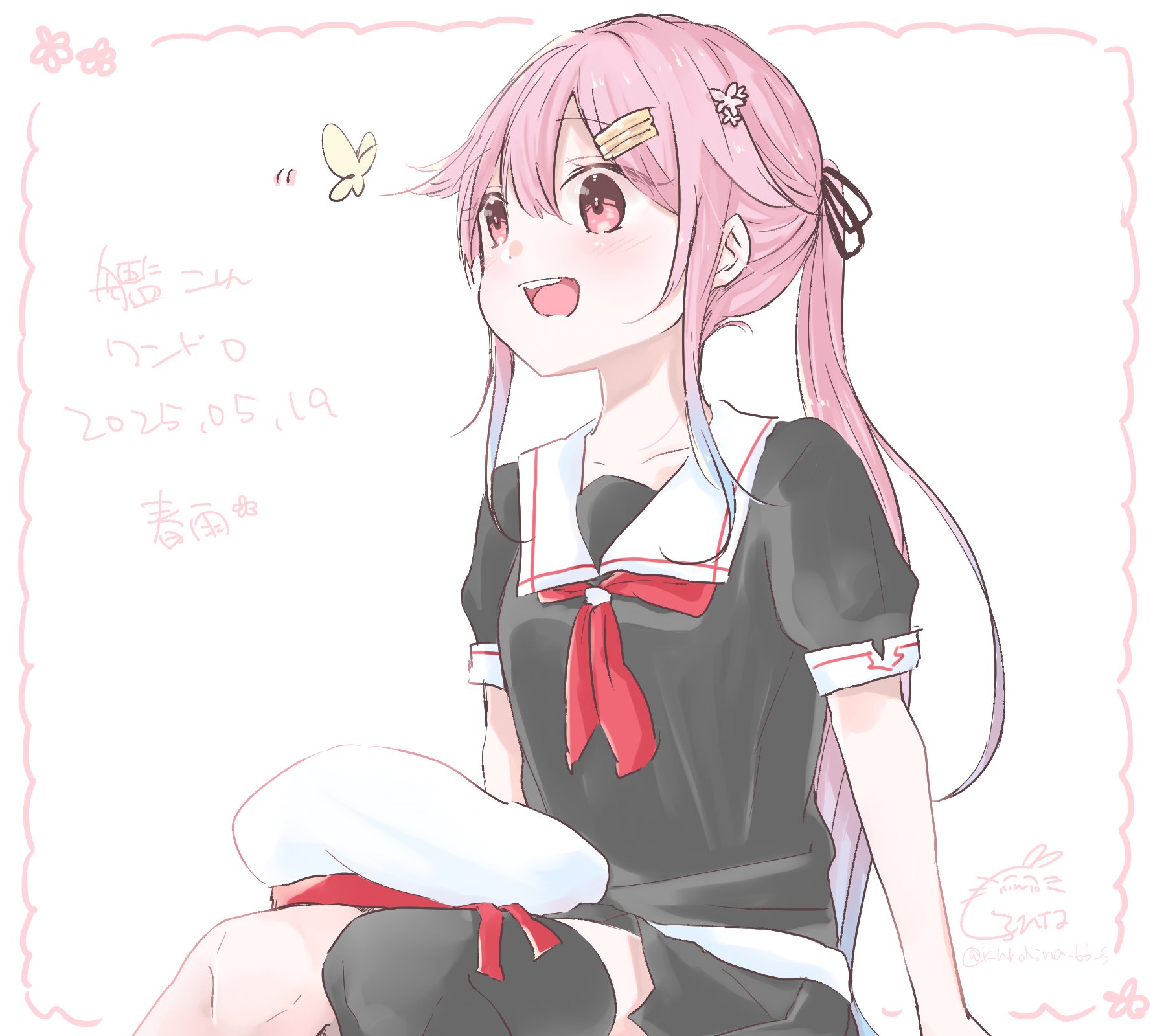 1girl black_serafuku black_skirt black_thighhighs bug butterfly gradient_hair hair_flaps harusame_(kancolle) harusame_kai_ni_(kancolle) hat highres insect kantai_collection kurohina_(kurohina_66_s) long_hair multicolored_hair neckerchief one-hour_drawing_challenge pink_hair red_eyes red_neckerchief sailor_collar sailor_shirt school_uniform serafuku shirt side_ponytail single_thighhigh skirt smile solo thighhighs unworn_hat unworn_headwear white_hat white_sailor_collar