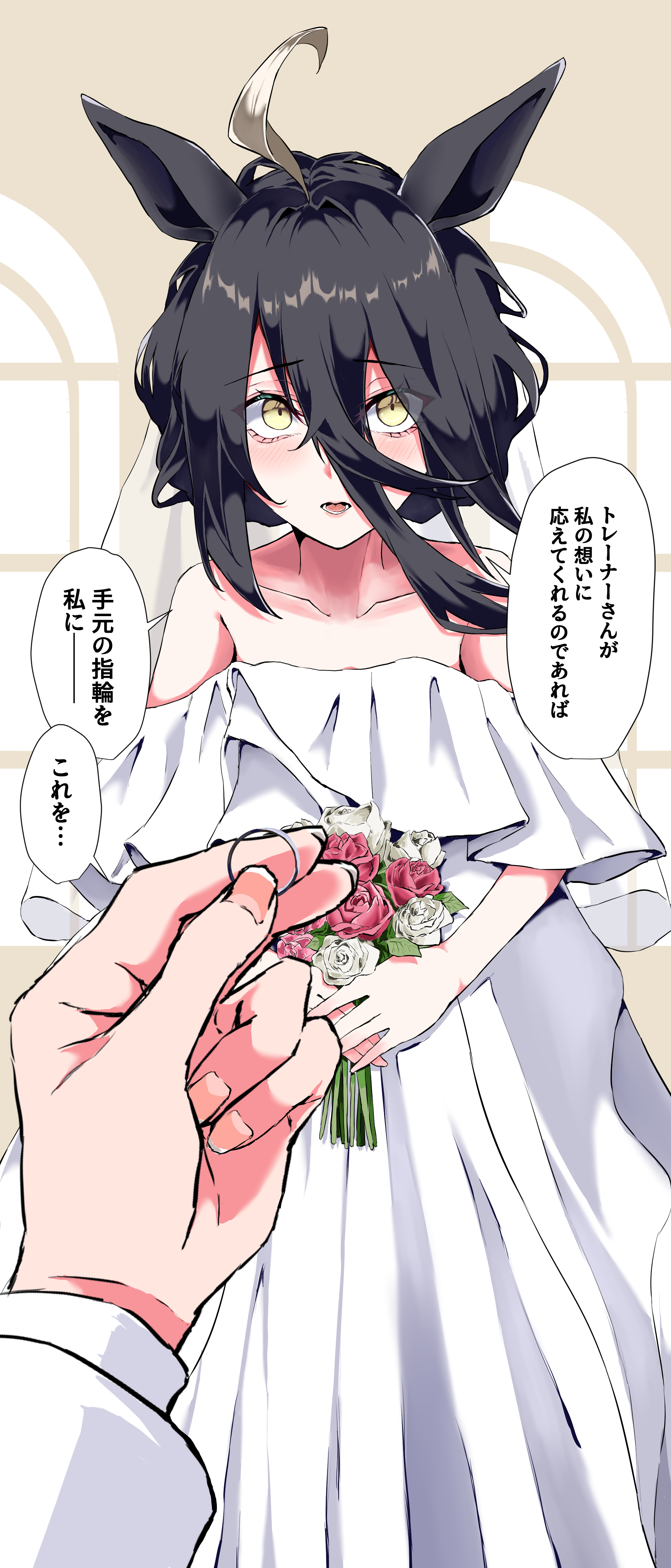 absurdres ahoge animal_ears arched_window black_hair blush bride collarbone commentary_request dress flower groom hair_between_eyes highres holding holding_flower holding_jewelry holding_ring horse_ears horse_girl jewelry looking_at_viewer manhattan_cafe_(umamusume) off-shoulder_dress off_shoulder open_mouth own_hands_together potechitarou pov ring solo_focus teeth translation_request umamusume wedding wedding_dress wide-eyed window yellow_eyes