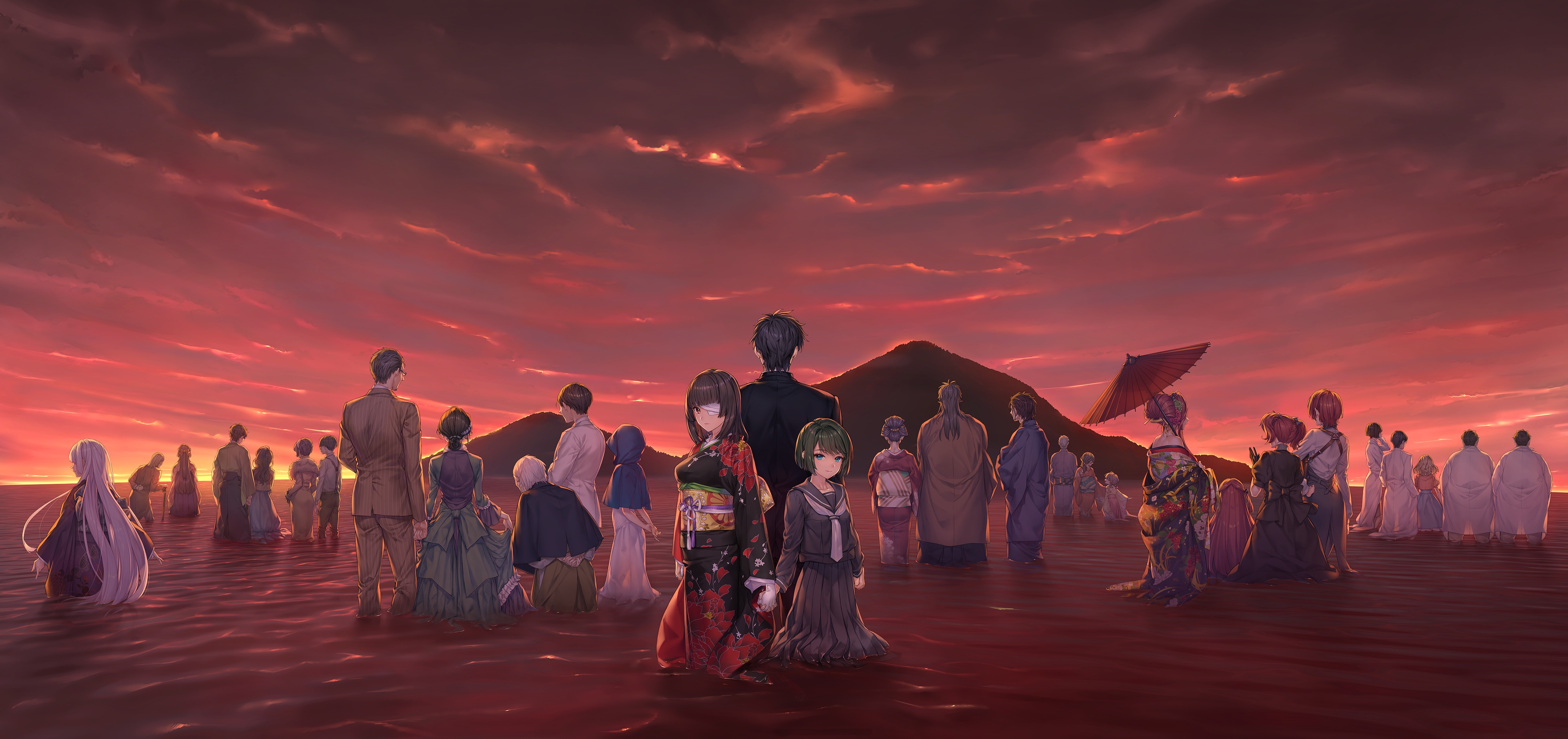 6+boys 6+girls absurdres black_hair cloud cloudy_sky dress dusk everyone eyepatch formal_clothes futara_mirei futara_ryuuichi futara_ryuuken futara_ryuusei futara_touko gosha_kanji gosha_shizuku green_hair grey_hair highres hime_cut horizon ichikura_madoka ichikura_sen ichikura_touri japanese_clothes kaguyuzu kazui_kouichi kazui_kouji kazui_koyuki kazui_mariko kazui_yukio kimono kuryo_nozomi long_hair mountain multiple_boys multiple_girls nie_no_hakoniwa non-web_source obi ocean official_art oil-paper_umbrella print_kimono red_hair rikugou_sanae rikugou_suzune rikugou_touichirou rikugou_touta saegusa_houka saegusa_renge saegusa_rinka saegusa_touka sash scenery school_uniform serafuku shiki_dougen shiki_kyoko shiki_yorimichi shiki_yukiko sky suit umbrella wading water yasaka_io yasaka_kurou