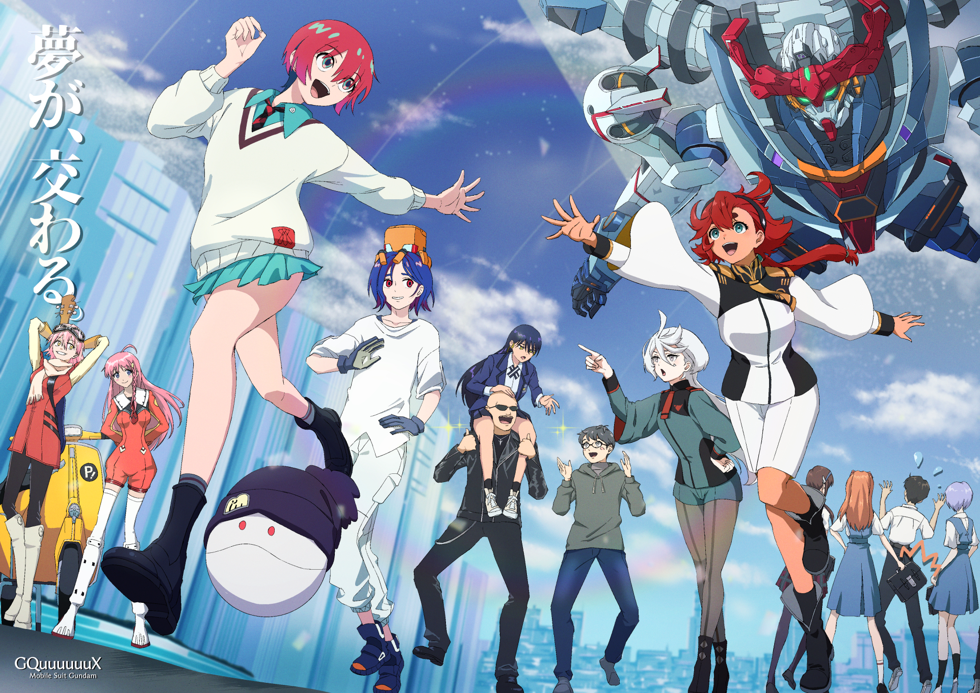 4boys 6+girls amate_yuzuriha aqua_shirt aqua_skirt arms_behind_head asticassia_school_uniform ayanami_rei black-framed_eyewear black_hair black_jacket black_pants blazer blue_gloves blue_hair blue_jacket blue_skirt brown_hair character_request collared_shirt copyright_name creator_connection crossover day flcl floating_hair glasses gloves green_eyes grin guitar gundam gundam_gquuuuuux gundam_suisei_no_majo halo haruhara_haruko highres ikari_shinji instrument jacket long_hair long_sleeves mafia_kajita makinami_mari_illustrious medium_skirt miniskirt miorine_rembran mobile_suit multiple_boys multiple_girls necktie neon_genesis_evangelion nono_(top_wo_nerae_2!) nyaan_(gundam_gquuuuuux) open_clothes open_jacket outdoors pants pink_hair pleated_skirt real_life red_eyes red_hair red_necktie running scarf school_uniform shirt short_hair shorts shoulder_boards shuji_ito skirt smile souryuu_asuka_langley suletta_mercury sunglasses sweater takatoshi thick_eyebrows thighhighs tokyo-3_middle_school_uniform top_wo_nerae!_(series) top_wo_nerae_2! white_pants white_scarf white_shirt white_shorts white_sweater white_thighhighs wing_collar zettai_ryouiki