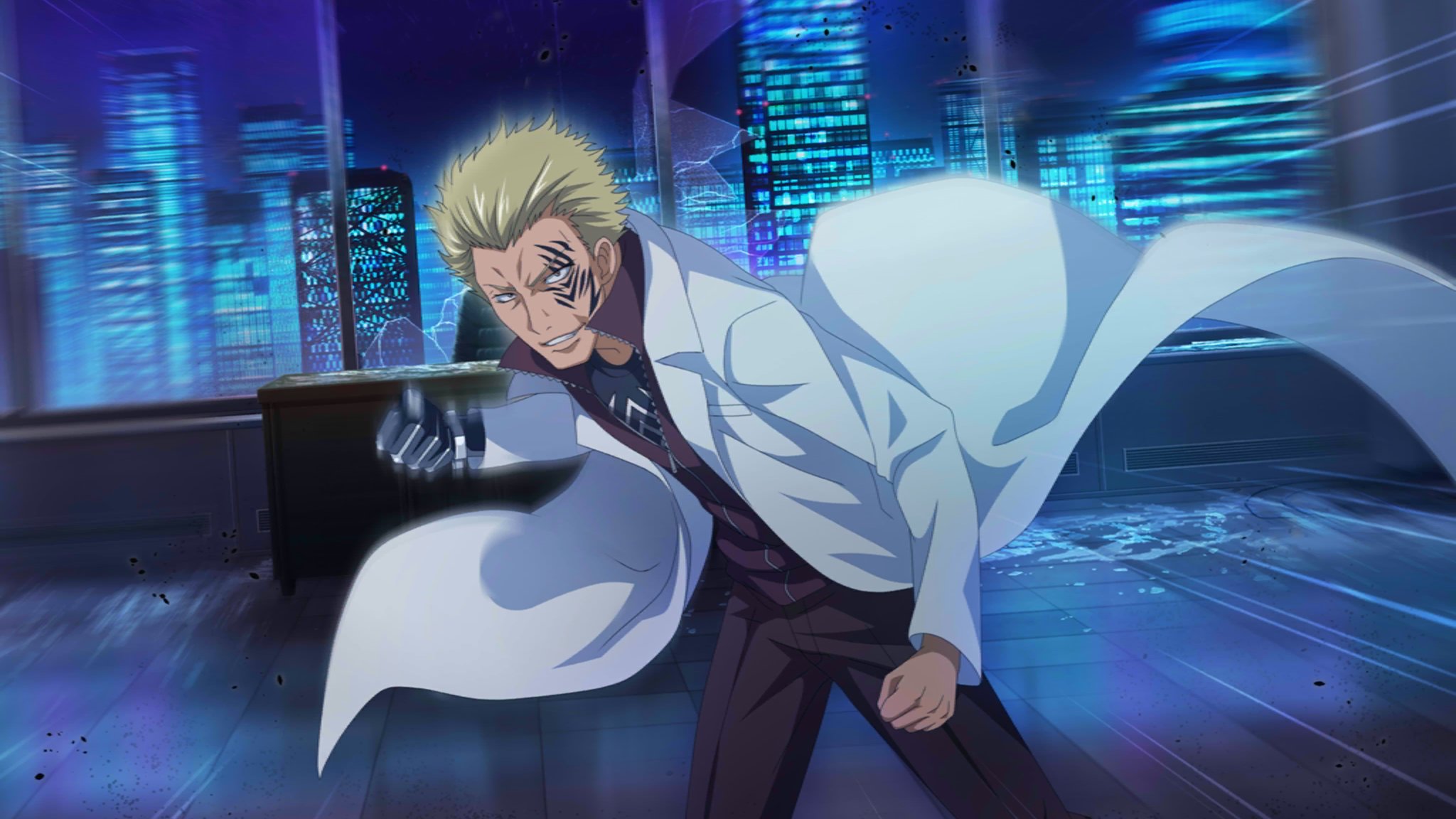 1boy black_shirt blonde_hair broken_glass building chair dark desk floor glass gloves highres indoors kihara_amata lab_coat male_focus night official_art pants shirt single_glove smile solo toaru_majutsu_no_index toaru_majutsu_no_index:_imaginary_fest