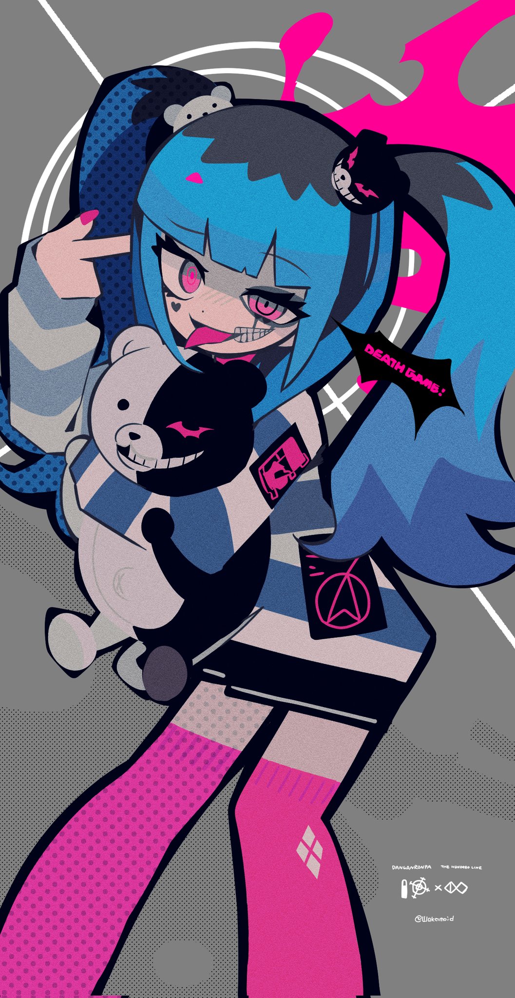 1girl amemiya_darumi bear_hair_ornament black_hair blue_hair creator_connection crossover danganronpa_(series) eyelashes fingernails grey_background hair_ornament highres looking_at_viewer makeup monokuma multicolored_hair nail_polish pink_eyes pink_nails pink_thighhighs shirt simple_background striped_clothes striped_shirt the_hundred_line_-last_defense_academy- thighhighs tongue tongue_out twintails wakamoid