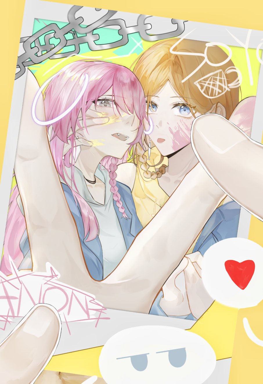 2girls bang_dream! bang_dream!_it's_mygo!!!!! blue_eyes braid brown_hair character_name chihaya_anon chinese_commentary commentary_request fang grey_eyes hair_between_eyes hand_on_another's_face heart highres hood hood_down hoodie koaok multiple_girls nagasaki_soyo open_mouth paint_splatter paint_splatter_on_face pink_hair side_braid white_hoodie yellow_hoodie yuri