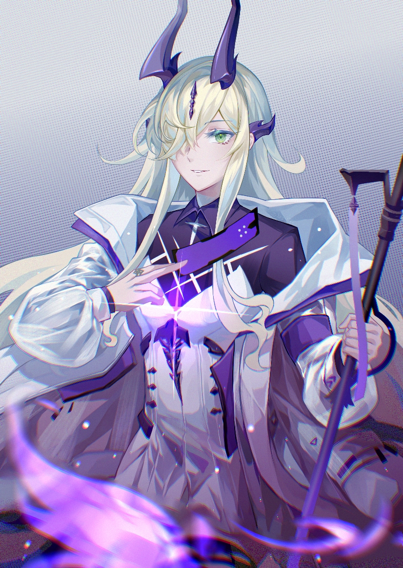 1girl arknights black_horns black_shirt blonde_hair card collared_shirt cowboy_shot dragon_horns dress fire green_eyes hair_over_one_eye holding holding_card holding_staff horns jacket jango_(winecrow) light_in_heart long_hair long_sleeves looking_at_viewer multiple_horns necrass_(arknights) open_clothes open_jacket parted_lips purple_fire shirt smile solo staff white_dress white_jacket wing_collar