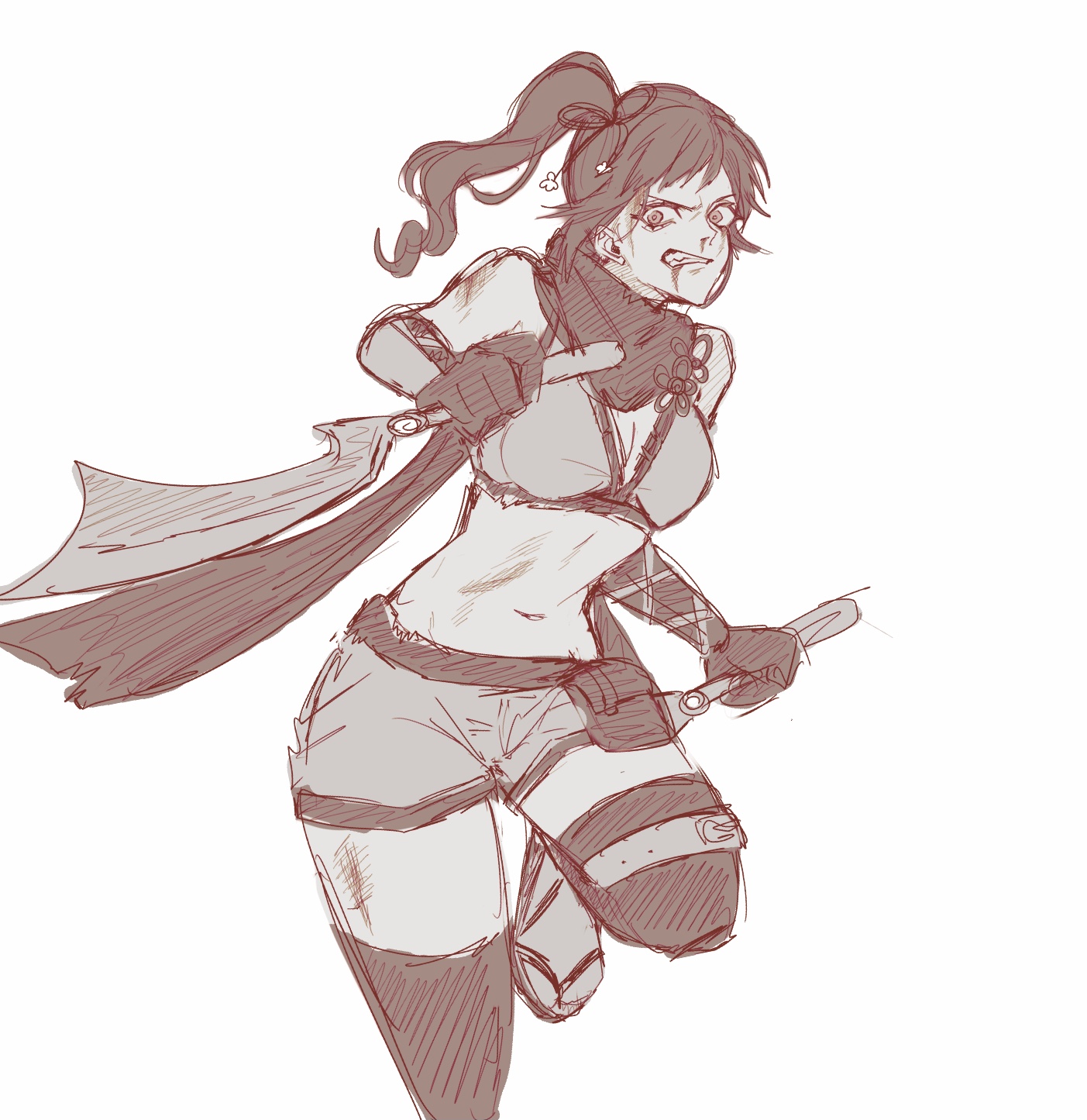blood blood_on_face breasts brown_eyes brown_hair cleavage crop_top dagger fishnet_thighhighs fishnets grimace highres knife kunoichi_(sengoku_musou) midriff navel ninja ponytail scarf sengoku_musou shorts side_ponytail sketch thighhighs thighs weapon