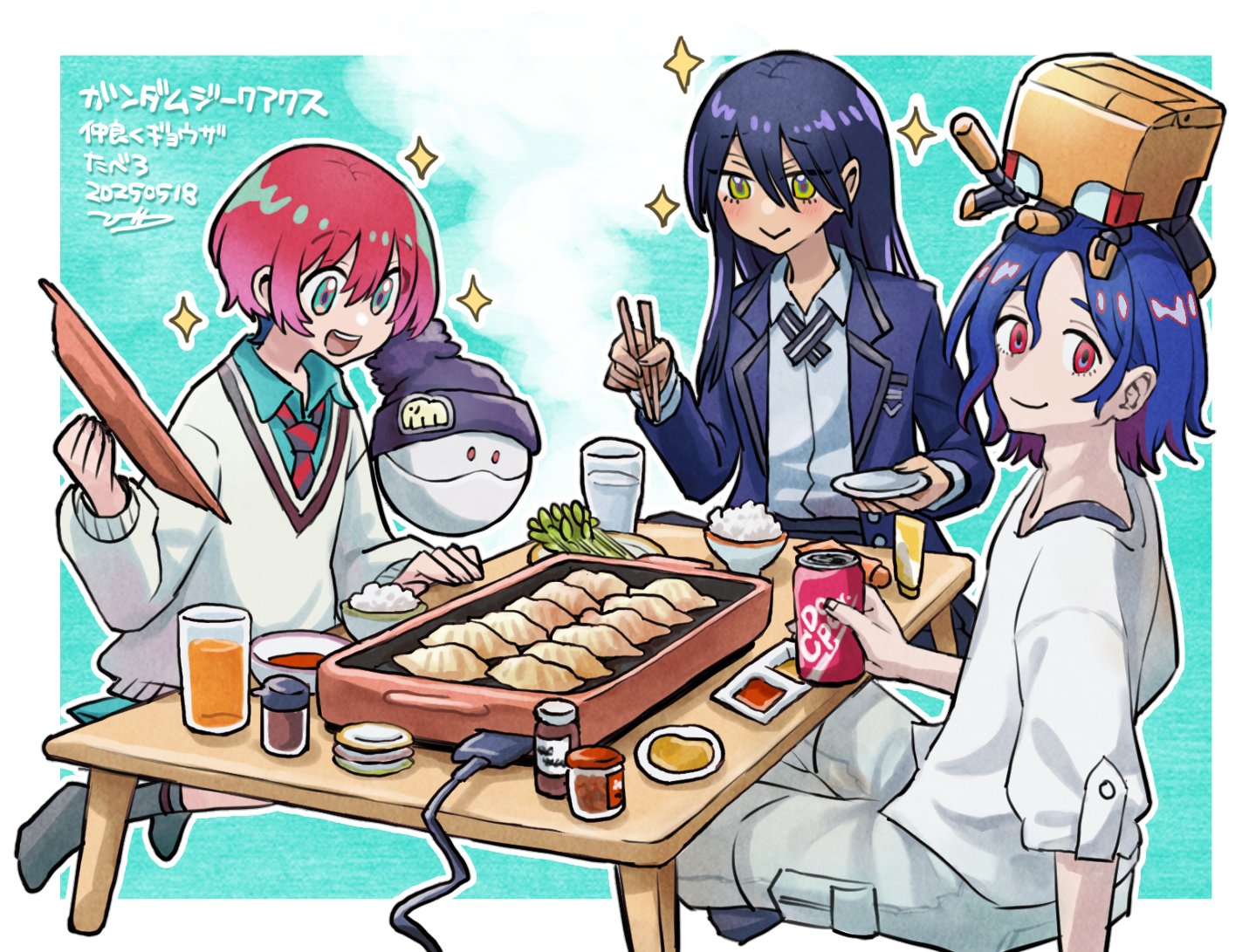 1boy 2girls amate_yuzuriha aqua_eyes blue_hair blush can collared_shirt colored_inner_hair conch_(gundam) cooking copyright_name cup dated drink_can dumpling food gundam gundam_gquuuuuux haro holding holding_can jacket jiaozi long_hair long_sleeves looking_at_viewer lower_eyelashes_only multicolored_hair multiple_girls necktie non-humanoid_robot nyaan_(gundam_gquuuuuux) open_mouth party plate purple_hair red_eyes red_hair rice robot satoruru school_uniform shirt short_hair shuji_ito sitting smile sparkle sweater table two-tone_hair yellow_eyes