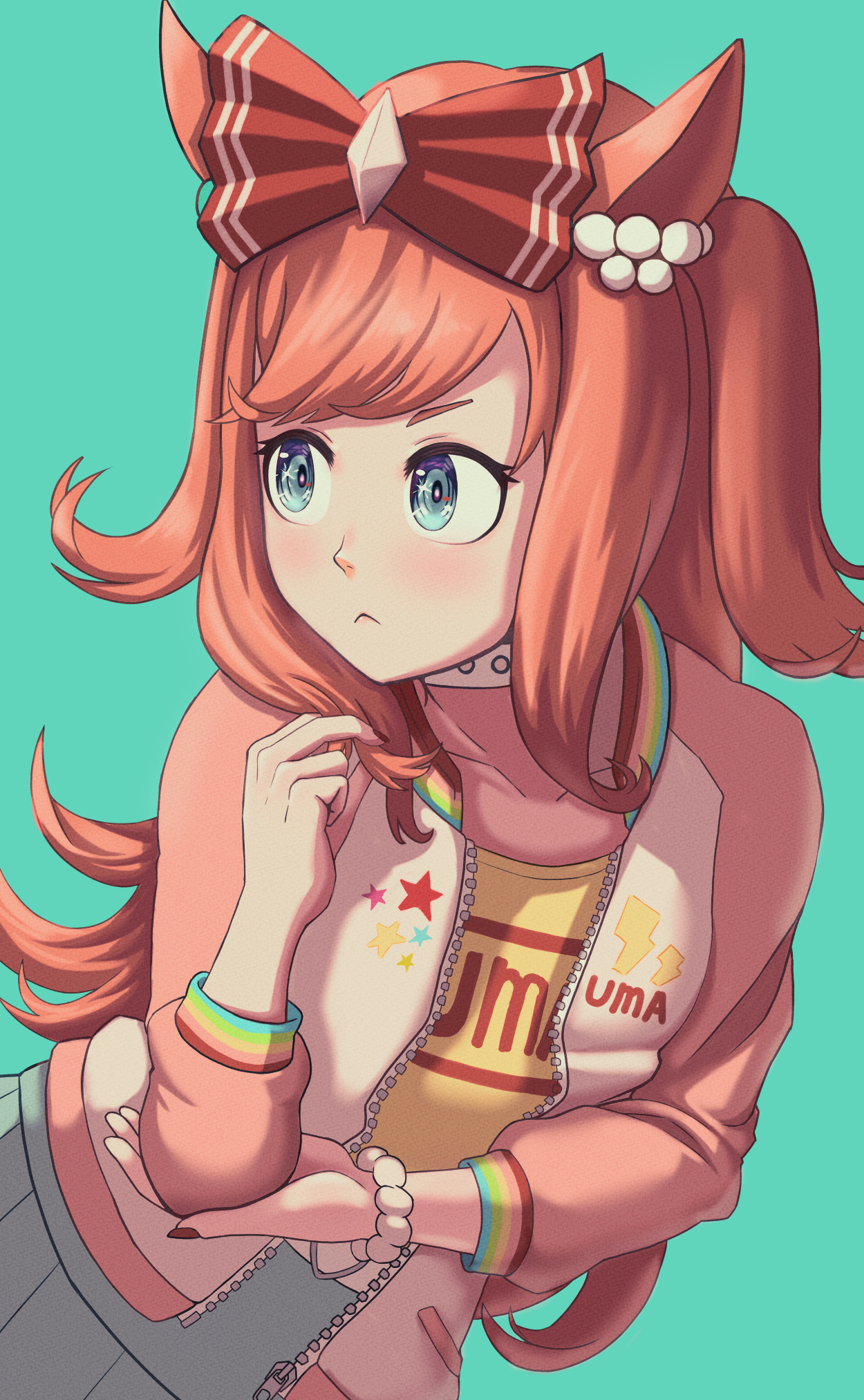 1girl agnes_digital_(umamusume) alternate_breast_size_(smaller) animal_ears aqua_background blue_eyes bow commentary_request ear_ornament flat_chest frown hair_bow highres horse_ears horse_girl long_hair ohmi-wisteria orange_hair red_bow shirt solo umamusume yellow_shirt