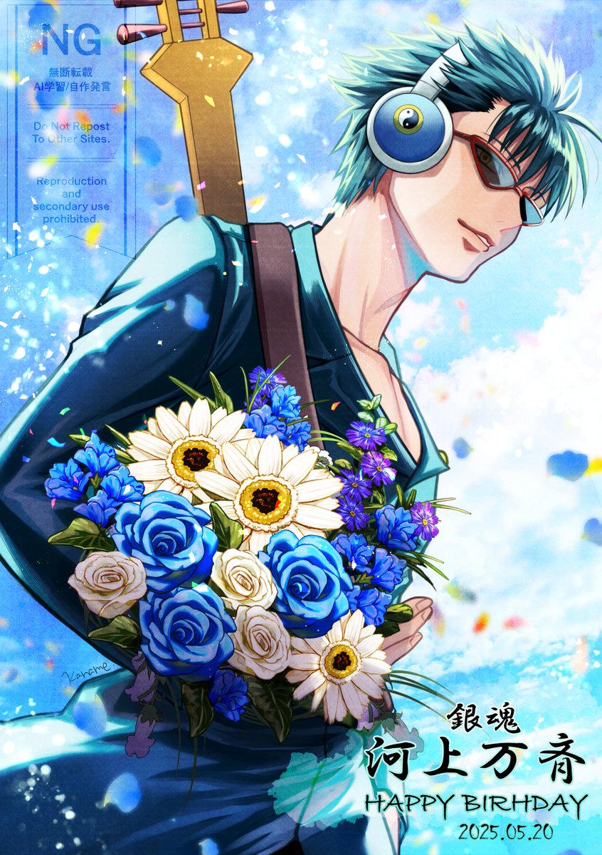 1boy blue_flower blue_hair blue_rose blue_theme bouquet character_name daisy_(flower) dated flower gintama guitar happy_birthday headphones highres holding holding_bouquet instrument kawakami_bansai kuonxkuon male_focus petals rose short_hair shoulder_belt sky smile solo sunglasses tinted_eyewear white_flower white_rose yin_yang yin_yang_print