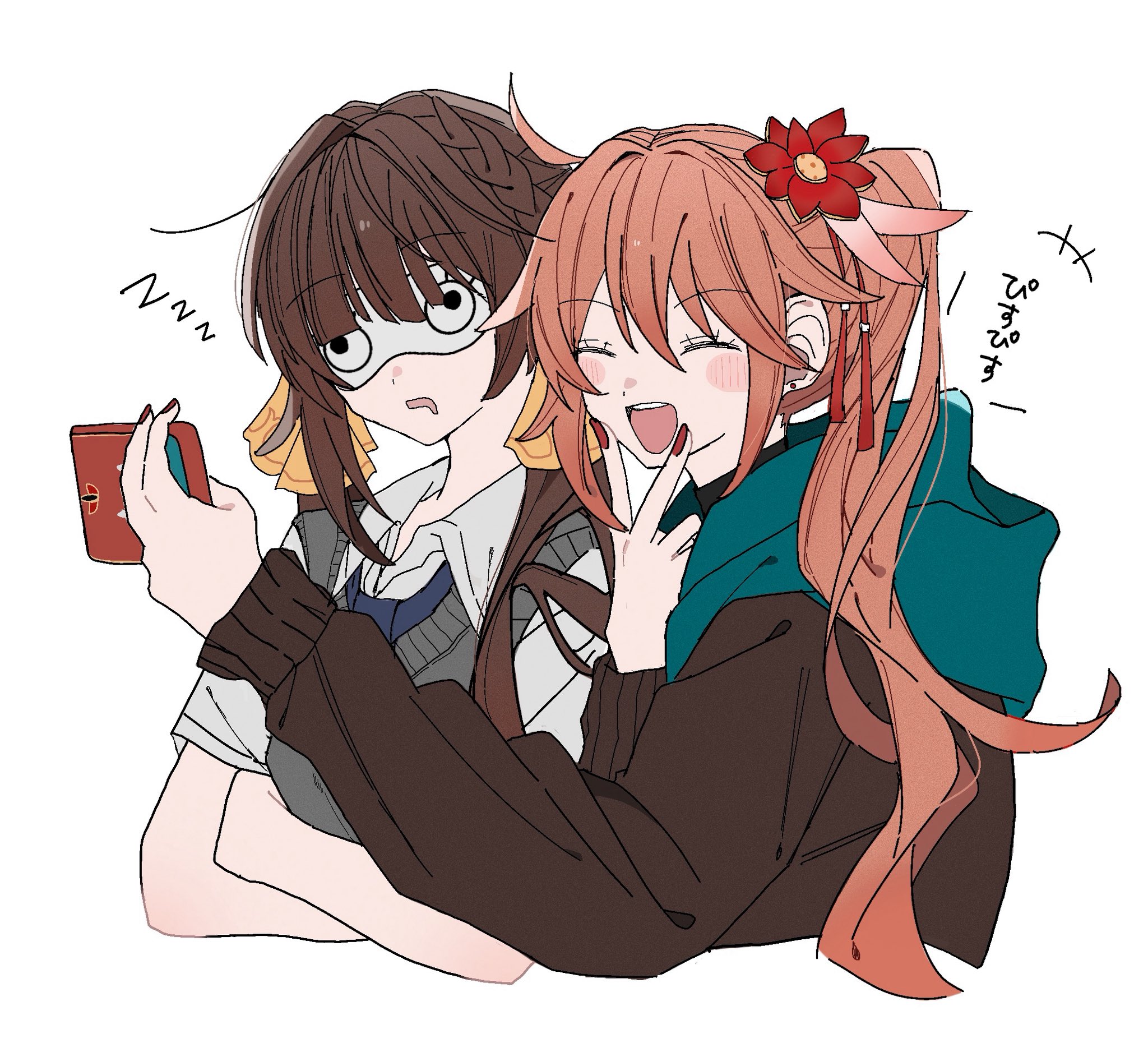 2girls blush_stickers brown_hair brown_sweater closed_eyes copyright_name eye_mask grey_vest guinaifen_(honkai:_star_rail) highres honkai:_star_rail honkai_(series) long_hair mask multiple_girls niupum open_mouth orange_hair selfie shirt sidelocks simple_background smile sushang_(honkai:_star_rail) sweater translation_request upper_body vest white_background white_shirt