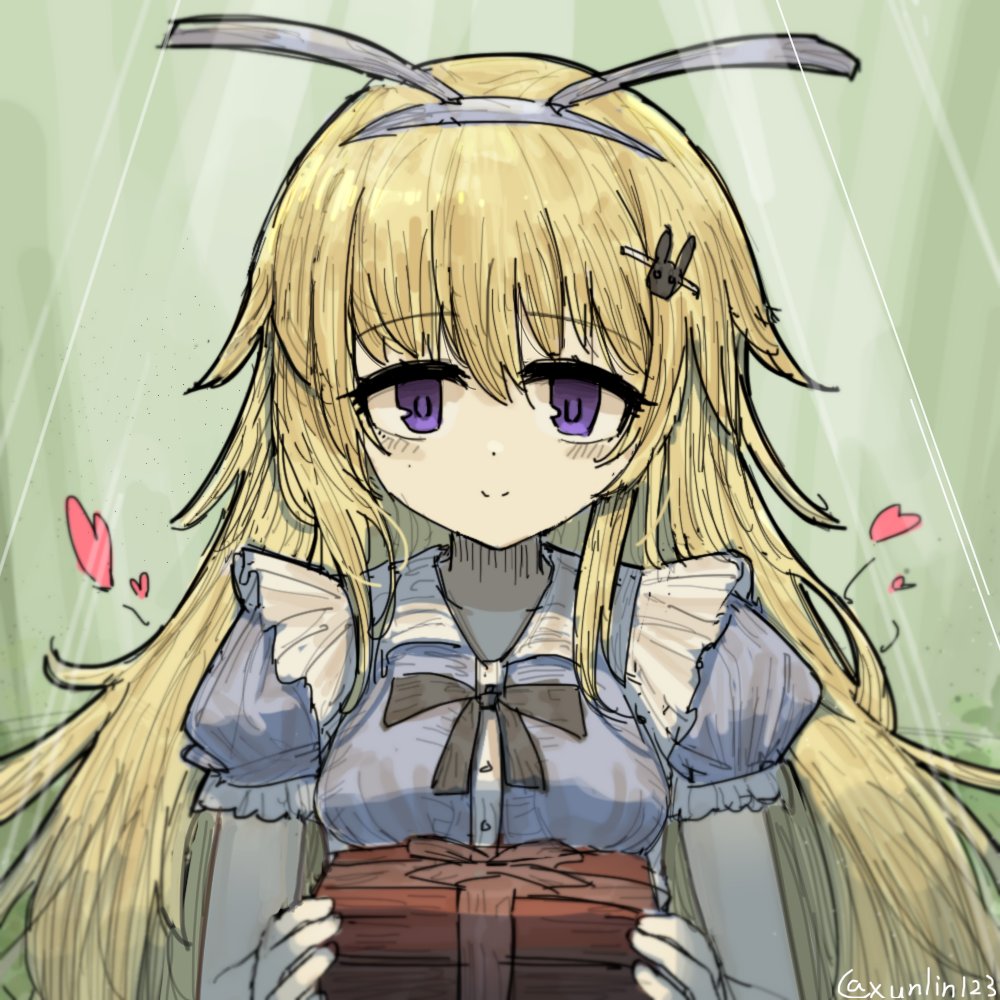 1girl alice_(black_souls) animal_ear_hairband animal_ears black_bow black_bowtie black_souls black_souls_2 blonde_hair blue_bow blue_headband blue_shirt bow bowtie box buttons fake_animal_ears frilled_sleeves frills gift gift_box green_background hair_ornament hairband hairclip headband heart holding holding_gift light_blush light_rays long_hair looking_at_viewer mole mole_under_eye purple_eyes rabbit_ear_hairband rabbit_ears rabbit_hair_ornament shirt short_sleeves signature sister_alice_(black_souls) smile solo xun_lin_(pixiv_93392103)
