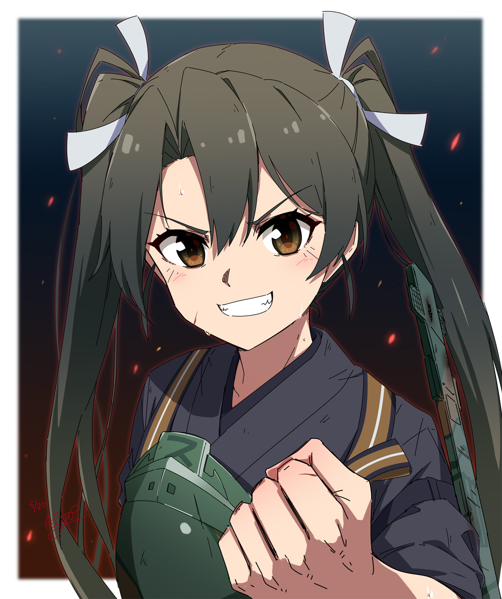 1girl black_kimono brown_eyes closed_eyes grey_hair grin highres japanese_clothes kantai_collection kimono kosode long_hair looking_at_viewer muneate necono_(nekonosora1207) one-hour_drawing_challenge smile solo tasuki twintails upper_body v-shaped_eyebrows zuikaku_(kancolle) zuikaku_kai_ni_(kancolle)
