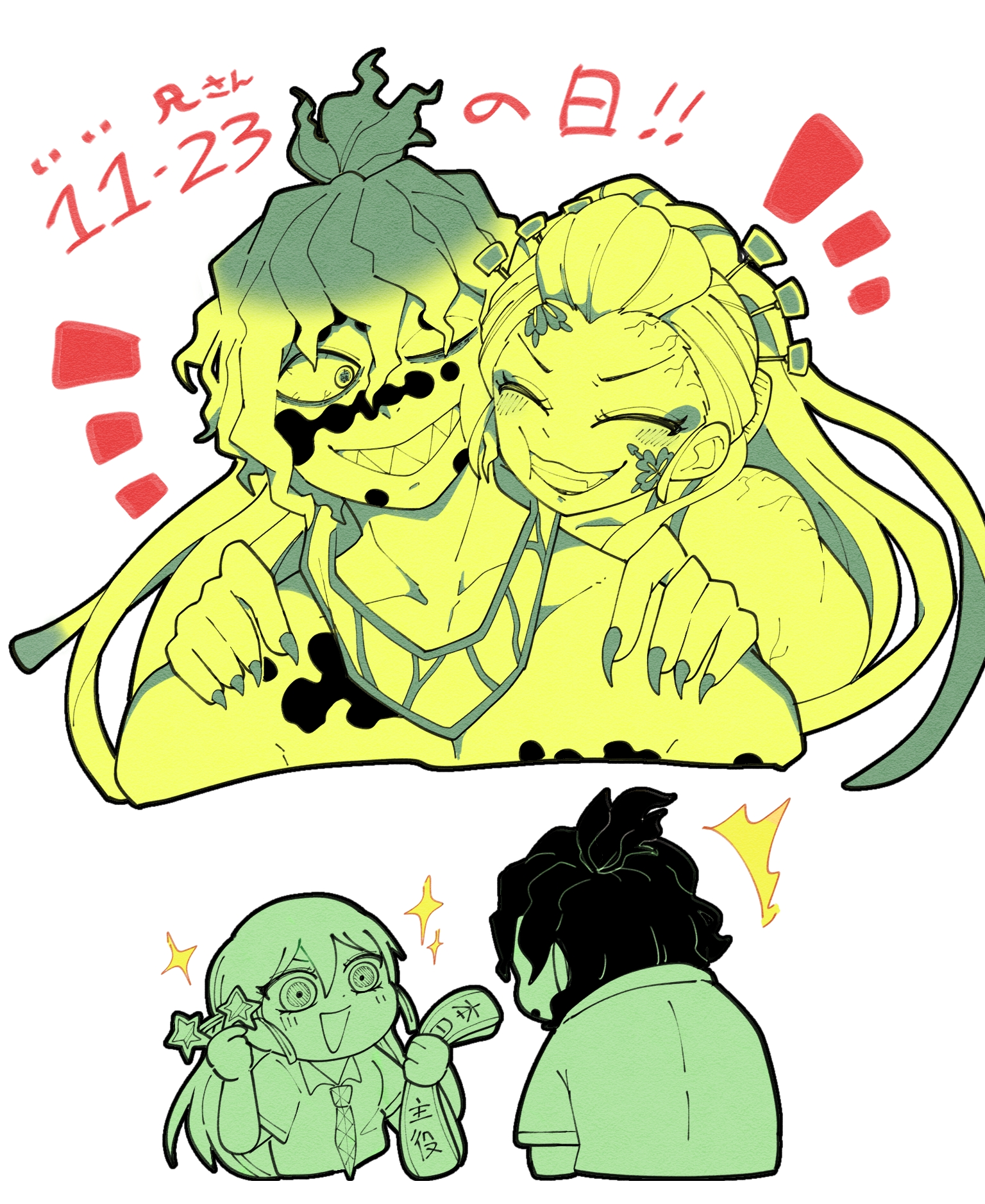 1boy 1girl ^^^ aged_down black_hair blush body_markings brother_and_sister closed_eyes commentary contemporary daki_(kimetsu_no_yaiba) dual_persona facial_mark facial_tattoo fingernails grin gyuutarou_(kimetsu_no_yaiba) hair_between_eyes hands_on_another's_shoulders happy highres kimetsu_gakuen kimetsu_no_yaiba long_hair looking_at_another multiple_views necktie one_eye_closed open_mouth ponytail sash school_uniform sharp_fingernails sharp_teeth short_hair short_ponytail siblings simple_background smile sparkle star-shaped_eyewear star_(symbol) tattoo teeth user_jzts3755 white_background white_hair