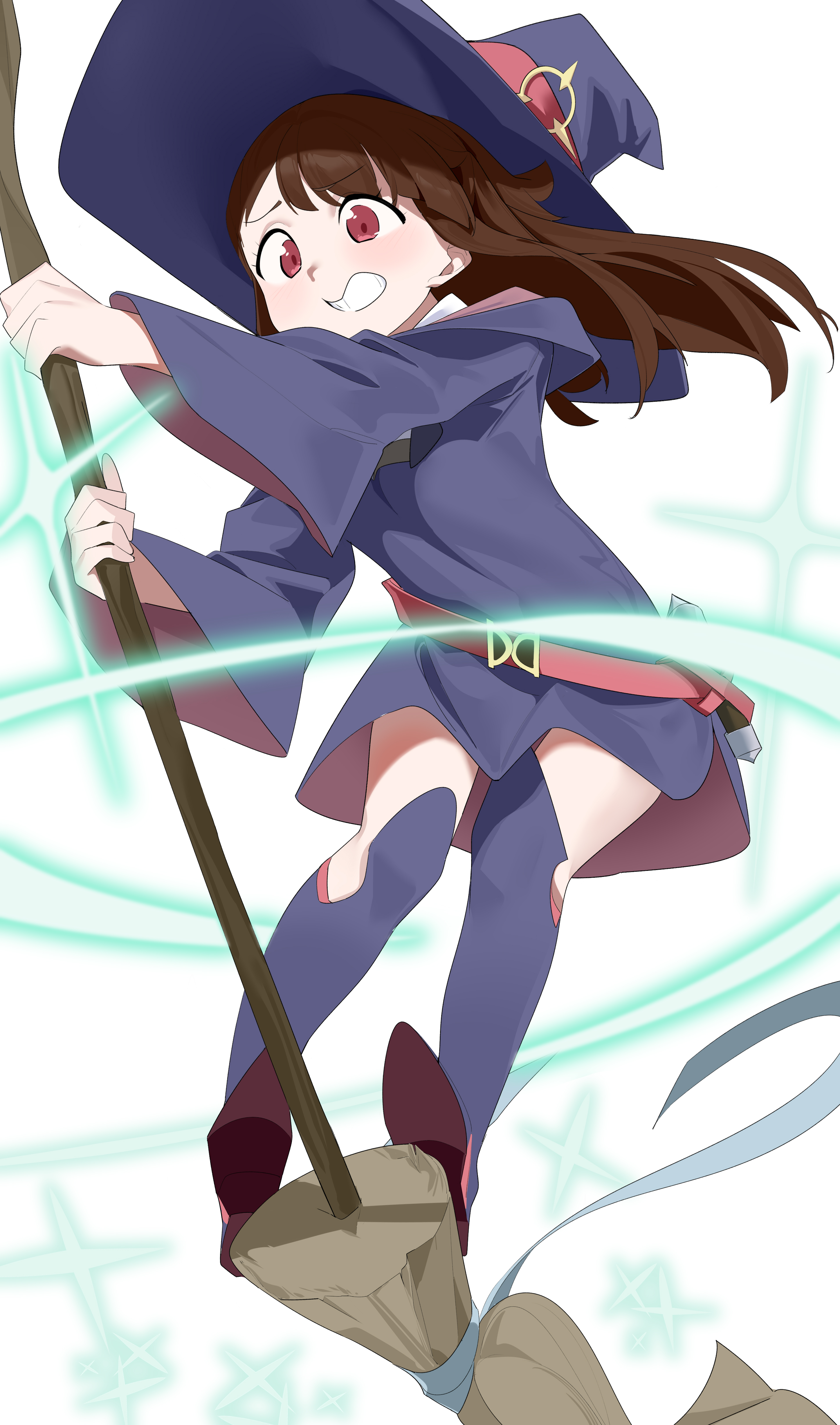 1girl absurdres blue_boots blue_hat boots broom broom_riding brown_hair commentary floating_hair hat highres holding holding_broom kagari_atsuko knee_boots large_hat little_witch_academia long_hair long_sleeves luna_nova_school_uniform red_eyes school_uniform simple_background solo teeth wako_(1194433260) white_background wide_sleeves witch witch_hat