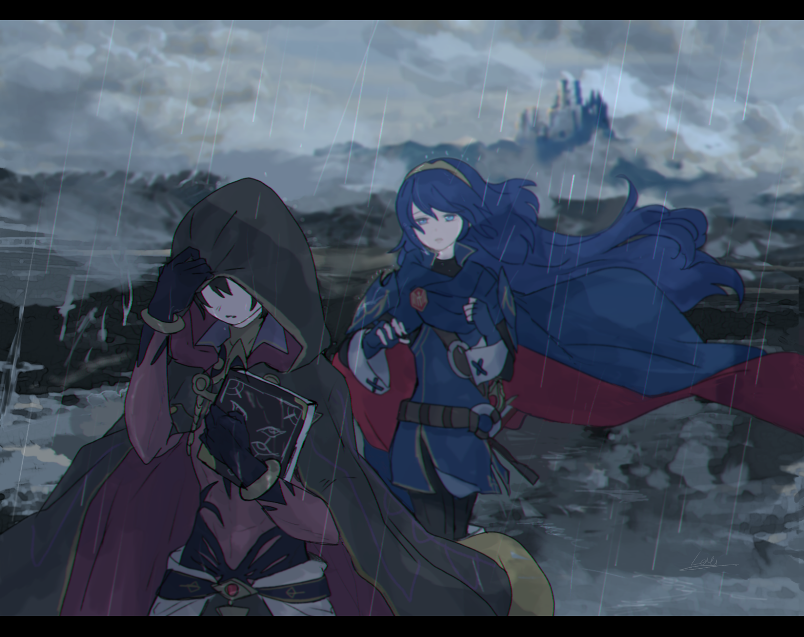 1boy 1girl belt black_gloves black_hair black_robe blue_cape blue_dress blue_eyes blue_gloves blue_hair book brown_belt cape castle commentary_request dress faceless faceless_male fingerless_gloves fire_emblem fire_emblem_awakening fire_emblem_heroes gloves highres holding holding_book hood hood_up hooded_robe long_hair lucina_(fire_emblem) male_morgan_(fated_darkness)_(fire_emblem) male_morgan_(fire_emblem) nintendo official_alternate_costume open_clothes open_robe outdoors rain red_cape robe sasaki_(dkenpisss) standing tiara white_wrist_cuffs wrist_cuffs