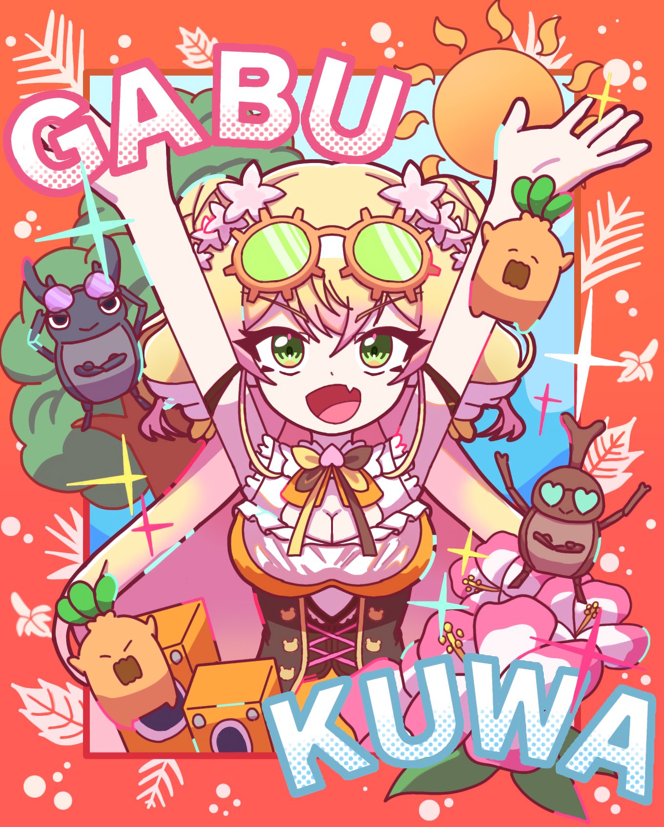 1girl \o/ arms_up blonde_hair bodice border bow bowtie breasts brown_bow brown_bowtie cleavage cleavage_cutout clothing_cutout commentary_request double-parted_bangs double_bun eyewear_on_head fang flower frilled_shirt frills green-tinted_eyewear green_eyes hair_bun hair_flower hair_ornament highres hololive hoshiume1207 looking_at_viewer mascot momosuzu_nene momosuzu_nene_(1st_costume) multicolored_bow multicolored_bowtie nekko_(momosuzu_nene) open_hand open_mouth orange_border orange_bow orange_bowtie orange_shirt outside_border outstretched_arms peach_ornament pink_flower rhinoceros_beetle shirt skin_fang smile speaker stag_beetle tinted_eyewear two_side_up underbust virtual_youtuber yellow_bow yellow_bowtie