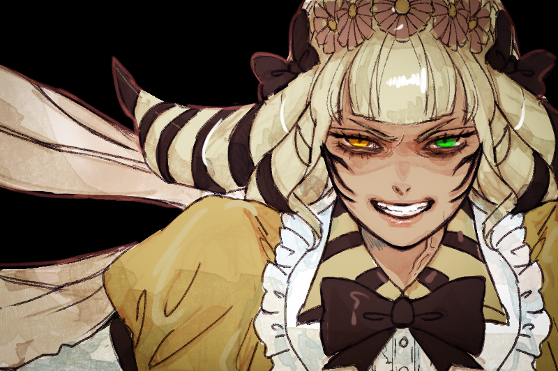 1girl black_background black_bow black_bowtie blonde_hair blunt_bangs bow bowtie facial_mark final_fantasy final_fantasy_xiv flower green_eyes grin hair_bow hair_flower hair_ornament heterochromia honey_b._lovely looking_at_viewer medium_hair multicolored_hair oyatsuredgray port smile solo straight-on two-tone_hair veins yellow_eyes