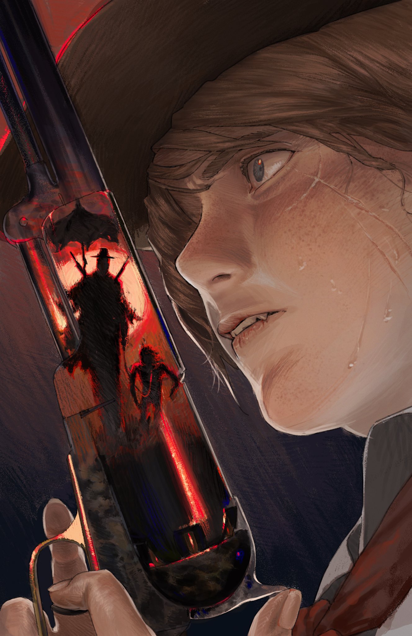 111papilio 1boy biting_own_lip blonde_hair blood_meridian blue_eyes fang gradient_background gun handgun highres reflection revolver scar scar_across_eye scar_on_face silhouette simple_background sunset the_kid_(blood_meridian) weapon