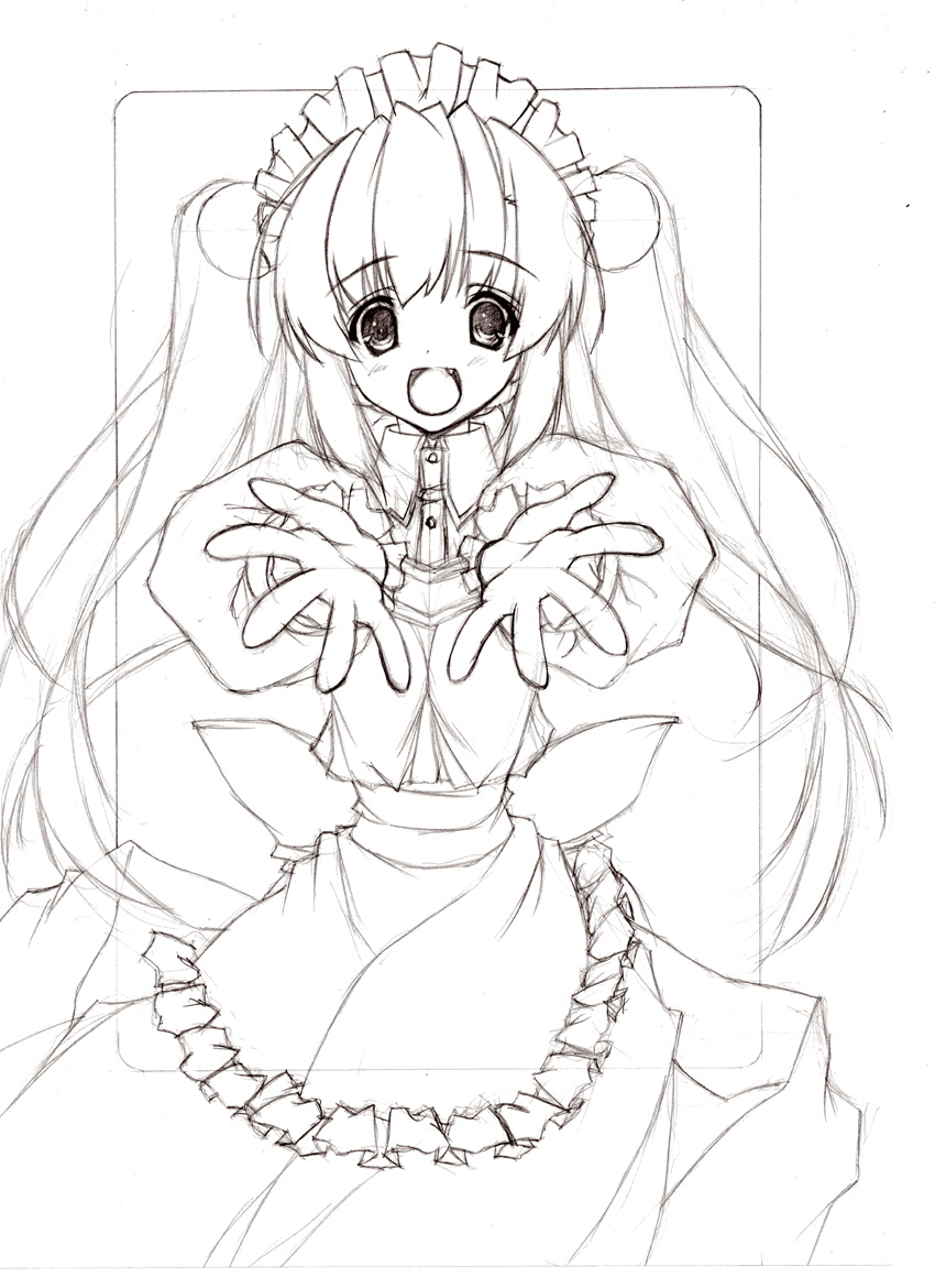 1girl 2000s_(style) :d apron blush commentary_request cowboy_shot curly_sue fang frilled_apron frills gloves greyscale hair_bobbles hair_ornament kafra_uniform long_hair looking_at_viewer maid maid_headdress monochrome open_mouth puffy_short_sleeves puffy_sleeves ragnarok_online reaching reaching_towards_viewer short_sleeves simple_background sketch smile solo twintails uzuki_sakura_(mmys534)
