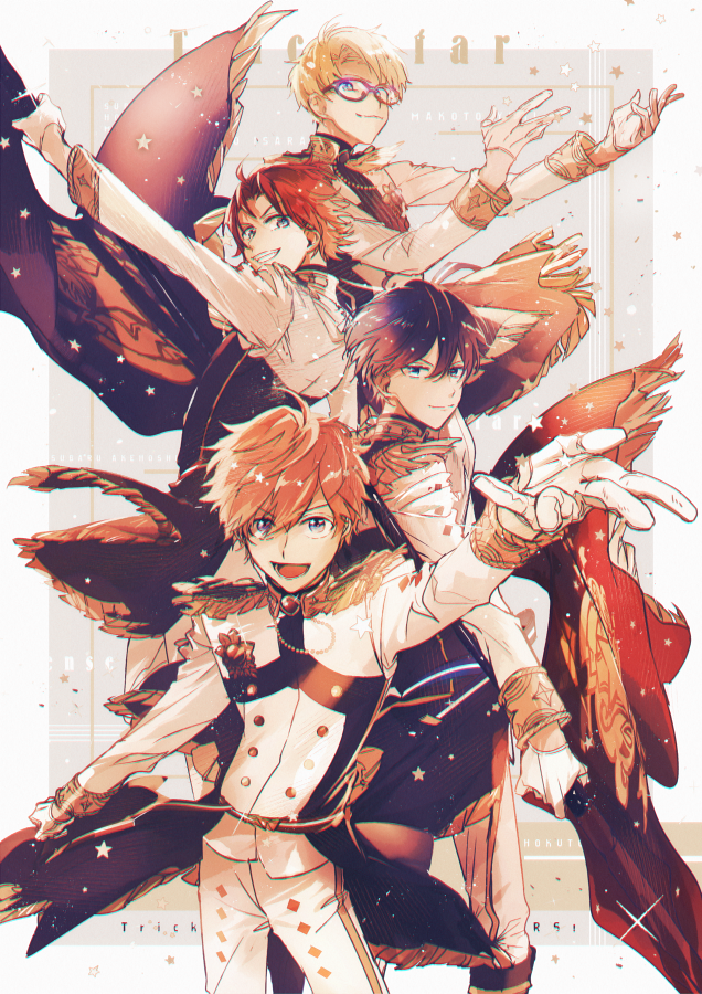 4boys akehoshi_subaru arm_up ayano_(katou) black_hair blonde_hair commentary ensemble_stars! glasses gloves hair_between_eyes hidaka_hokuto isara_mao long_sleeves looking_at_viewer multiple_boys official_alternate_costume open_mouth orange_hair outstretched_arm pants red_eyes short_hair smile untranslatable_commentary trickstar_(ensemble_stars!) white_gloves white_pants yuuki_makoto_(ensemble_stars!)